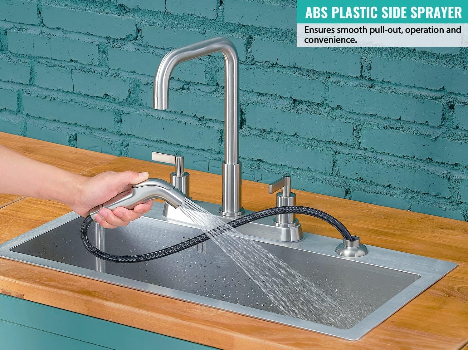 ABS Plastic side sprayer and 360 Degree Spout: Matching side spray provides flexibility and convenience for cleaning and food prep. High arch 360 degree swivel nozzle supply full range of washing for your kitchen sink.