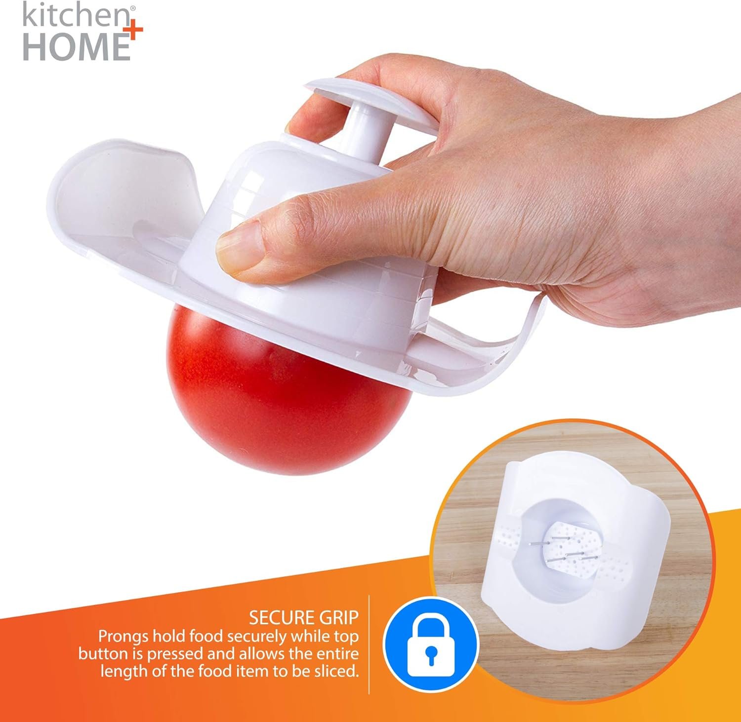SECURE GRIP – Prongs hold food securely while top button is pressed and allows the entire length of the food item to be sliced.