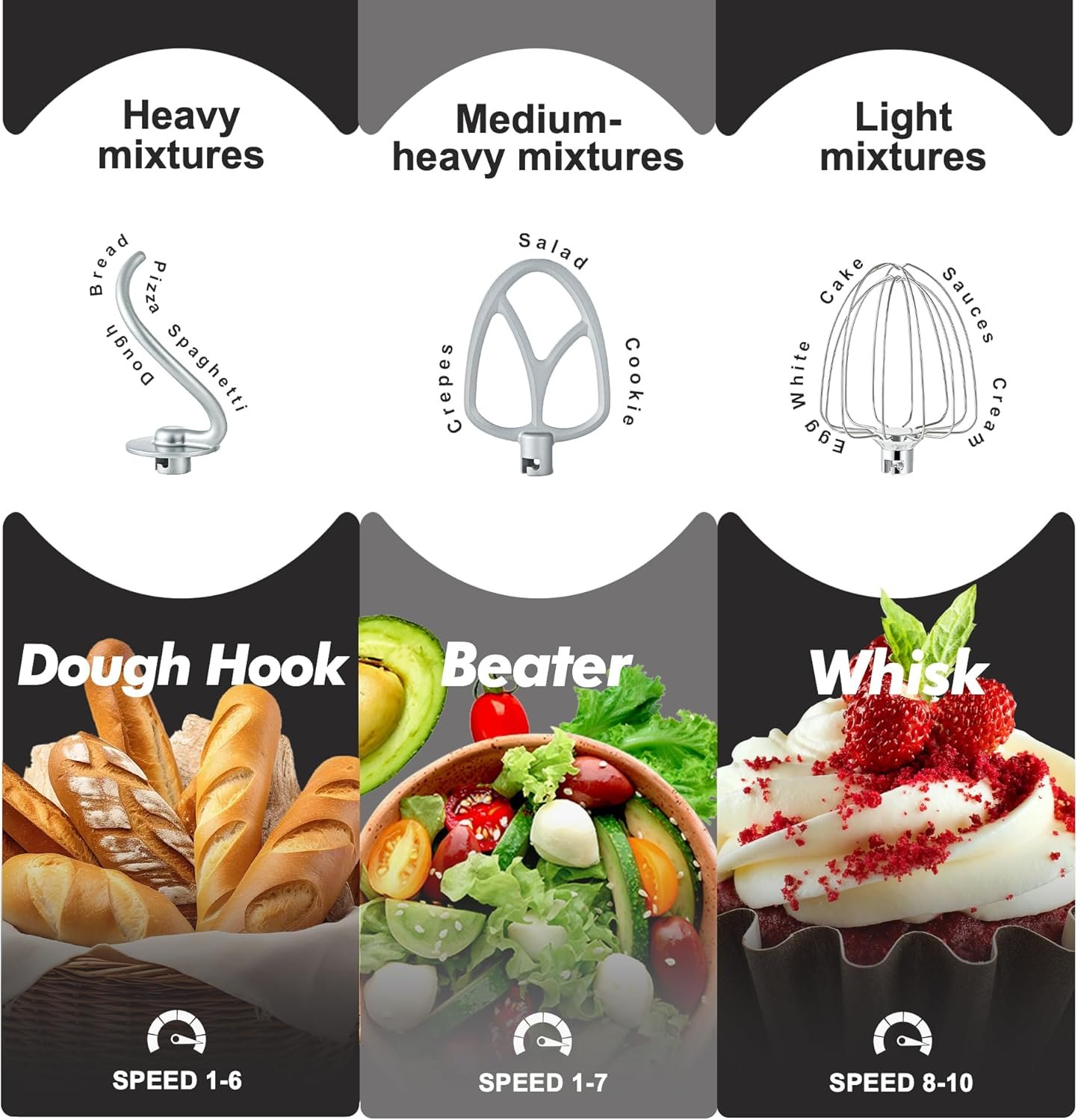 10 Speeds and Tilt Head Design – This Kitchen mixer has 10 different speed options,suitable for mixing bread dough, thick batters, meringues, and whipping cake cream, plus lower speeds for stirring and finessing your most delicate concoctions,could suit perfectly to different ingredients. Tilt-head design mixer allows access to install or uninstall bowls and accessories easily.