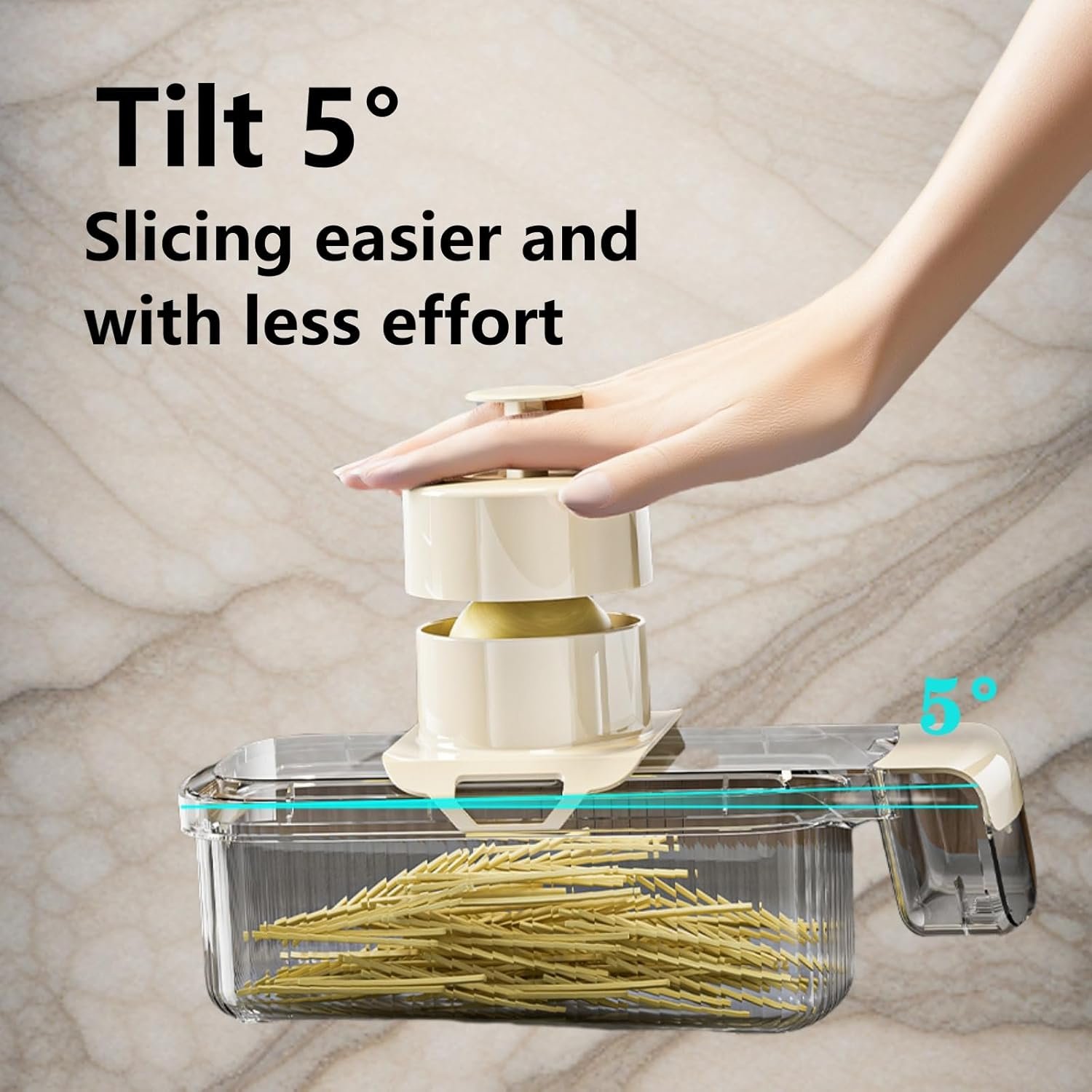 The 5° tilt angle allows for easier slicing and the slices fall into the storage box below;