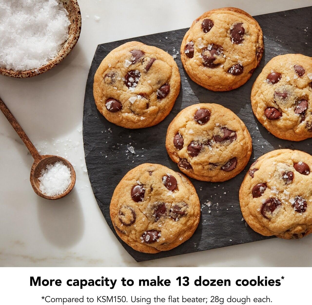 With 7 quart capacity, you can easily mix 13 dozen cookies per batch*, knead over 8.5 lbs of bread, or mash over 7.5 lbs of potatoes. *Using the flat beater; 28g dough each.