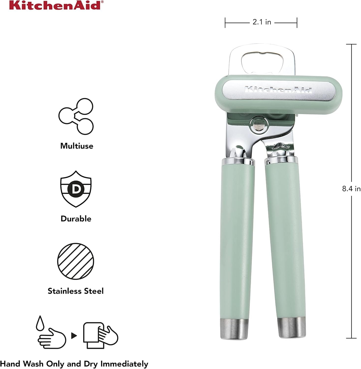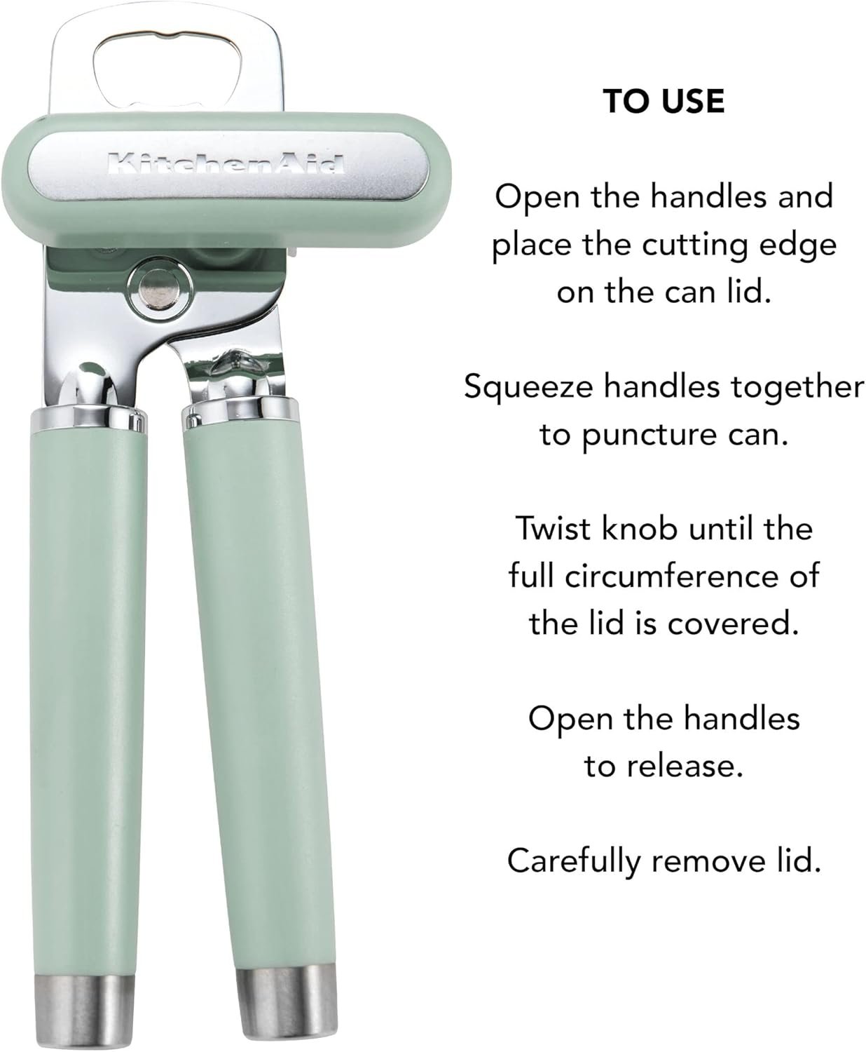 Open any sized can or bottle with the KitchenAid Gourmet Can Opener. The durable, razor-sharp stainless steel cutting wheel easily pierces and smoothly slices through cans, while the large knob provides a secure grip for effortless turning. The oversized, ergonomic handles provide maximum comfort and control for simple, safe use. This 2-in-1 tool features an integrated bottle opener to remove caps with ease. Hand wash with warm water and a mild detergent; rinse and dry immediately. One year hassle-free replacement and lifetime limited warranty.