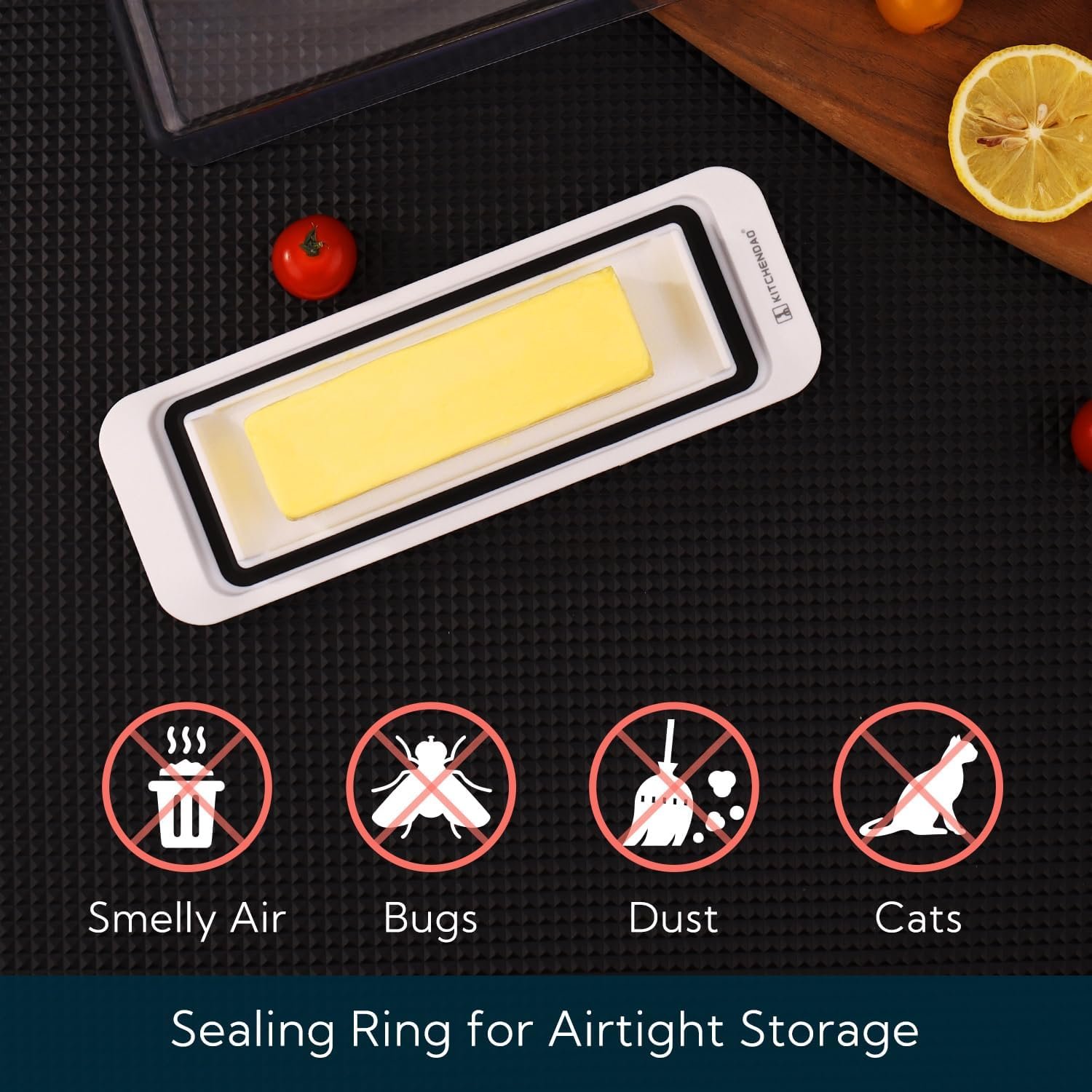 Sealing Ring to Keep Butter Fresh: With a built- in sealing ring ,this airtight butter keeper seals the freshness in and allows you to have soft butter out on the bar/ countertop all the time. It protects your butter from your cats, dust , bugs and anything else that might taint your butter
