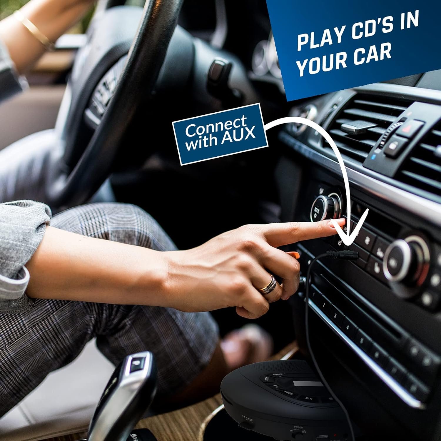 BUILT-IN SPEAKERS + AUX + SD/TF CARD READER + EARPHONES: This discman cd player is packed with connectivity features. Play tracks through the built-in dual stereo speakers or for better sound quality use the included earphones, directly from a CD or a TF card up to 32 GB. It’s also an excellent portable cd player for car using the included AUX cable.