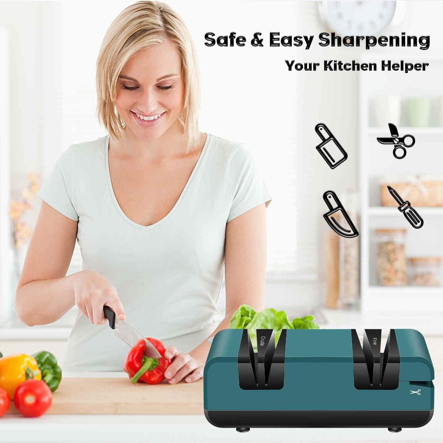 【Professional Knife Sharpener for Home】Our electric knife sharpener for all knives is designed for home and kitchen use, you can sharpen dull knives and scissors to the more sharp a short time, give you a good sharpening experience. Using our knife sharpener tool is more convenient and faster, saving you time in sharpening your knife