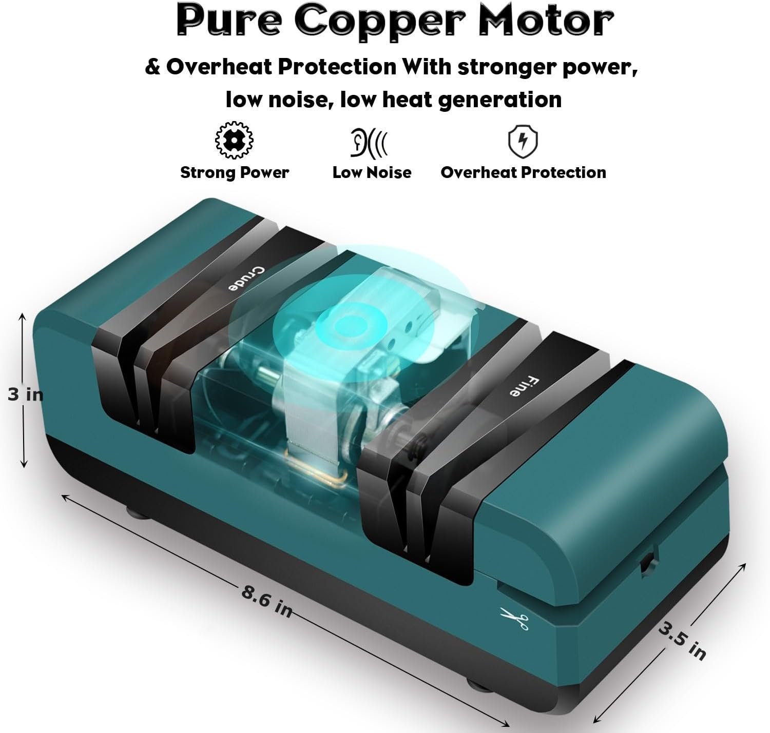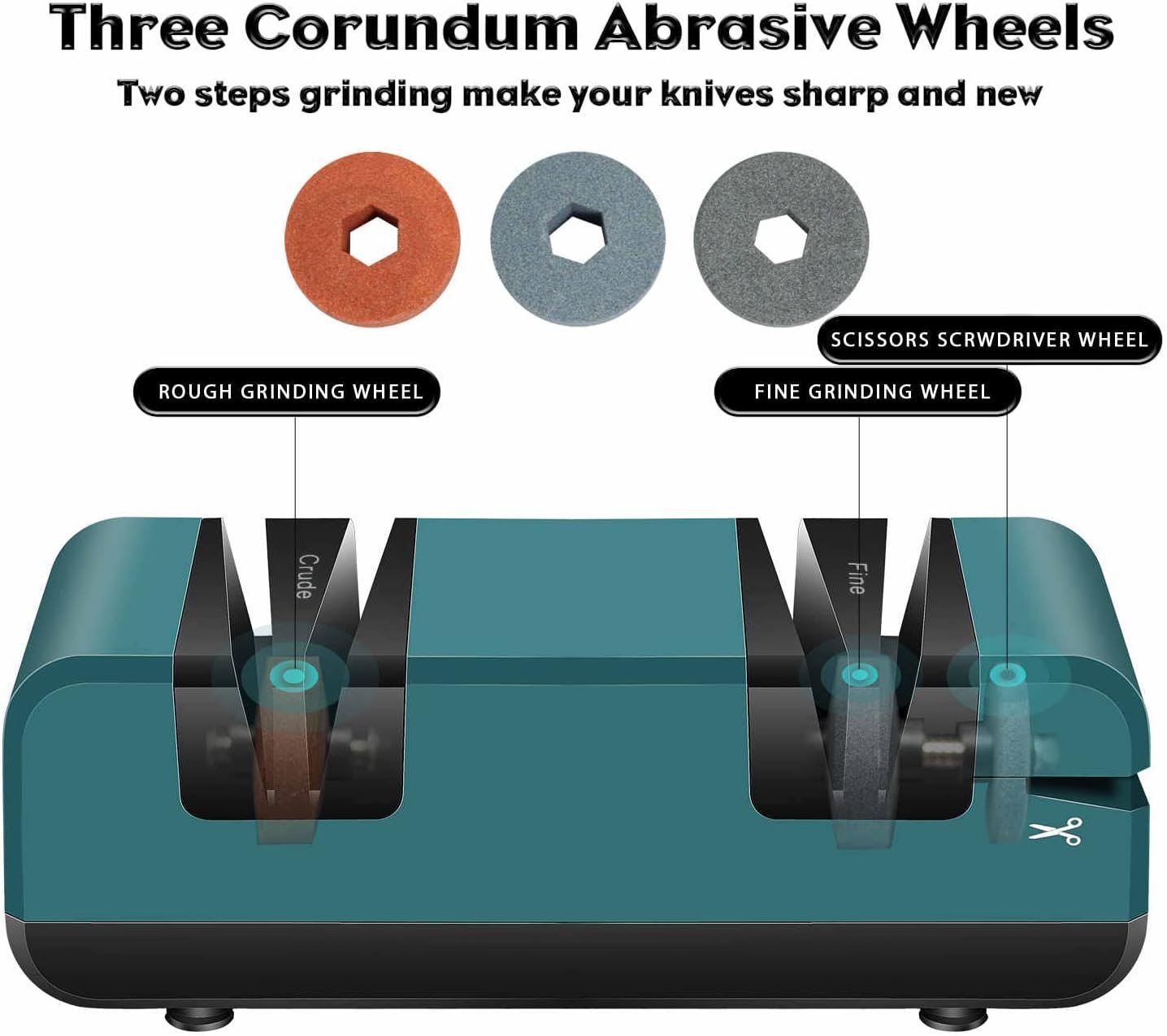 【With 3 Additonal Sharpening Wheels】This auto knife sharpener uses pure copper motor, which can achieve outstanding sharpen effects, stable working condition, low noise and long lifetime. The corundum abrasive wheels can avoid the blade stuck and we provide 3 extra grinding wheels