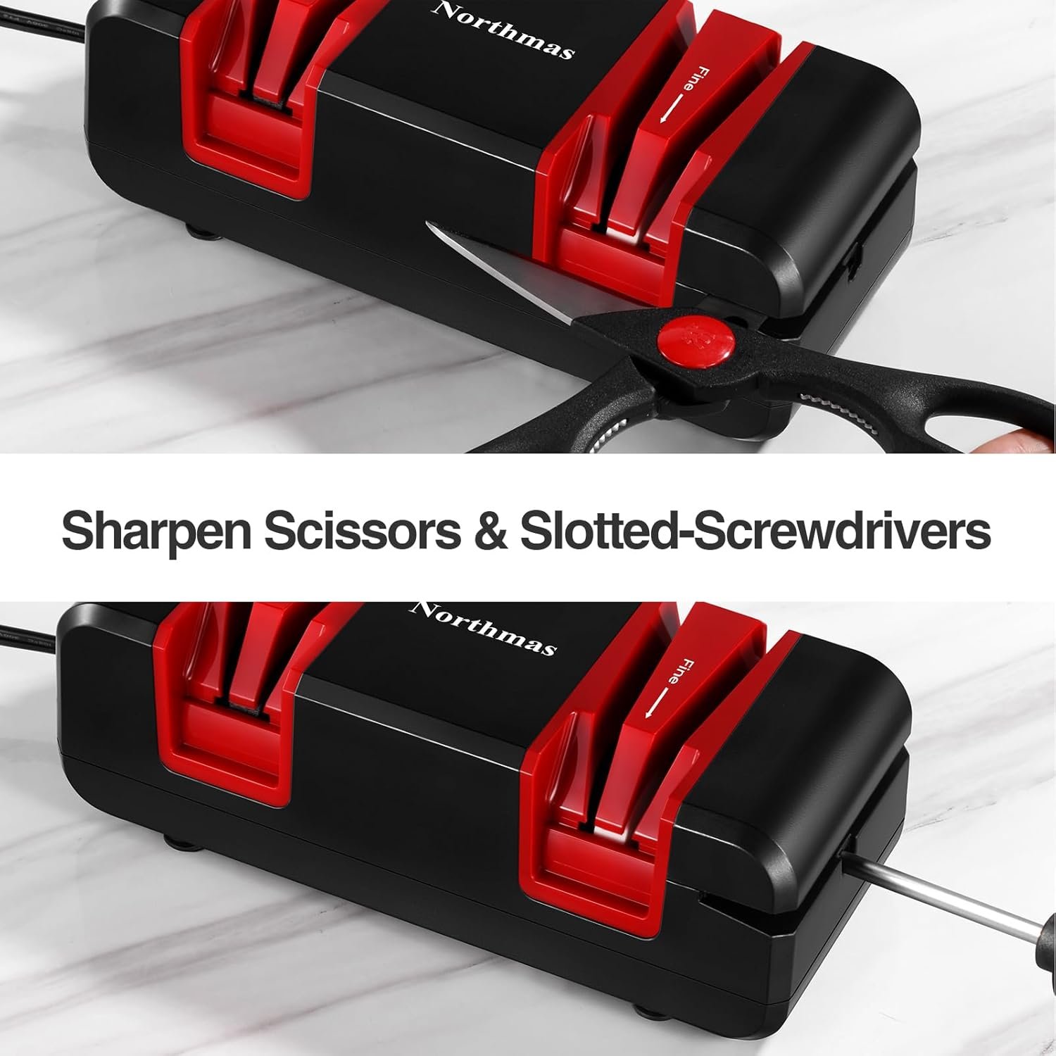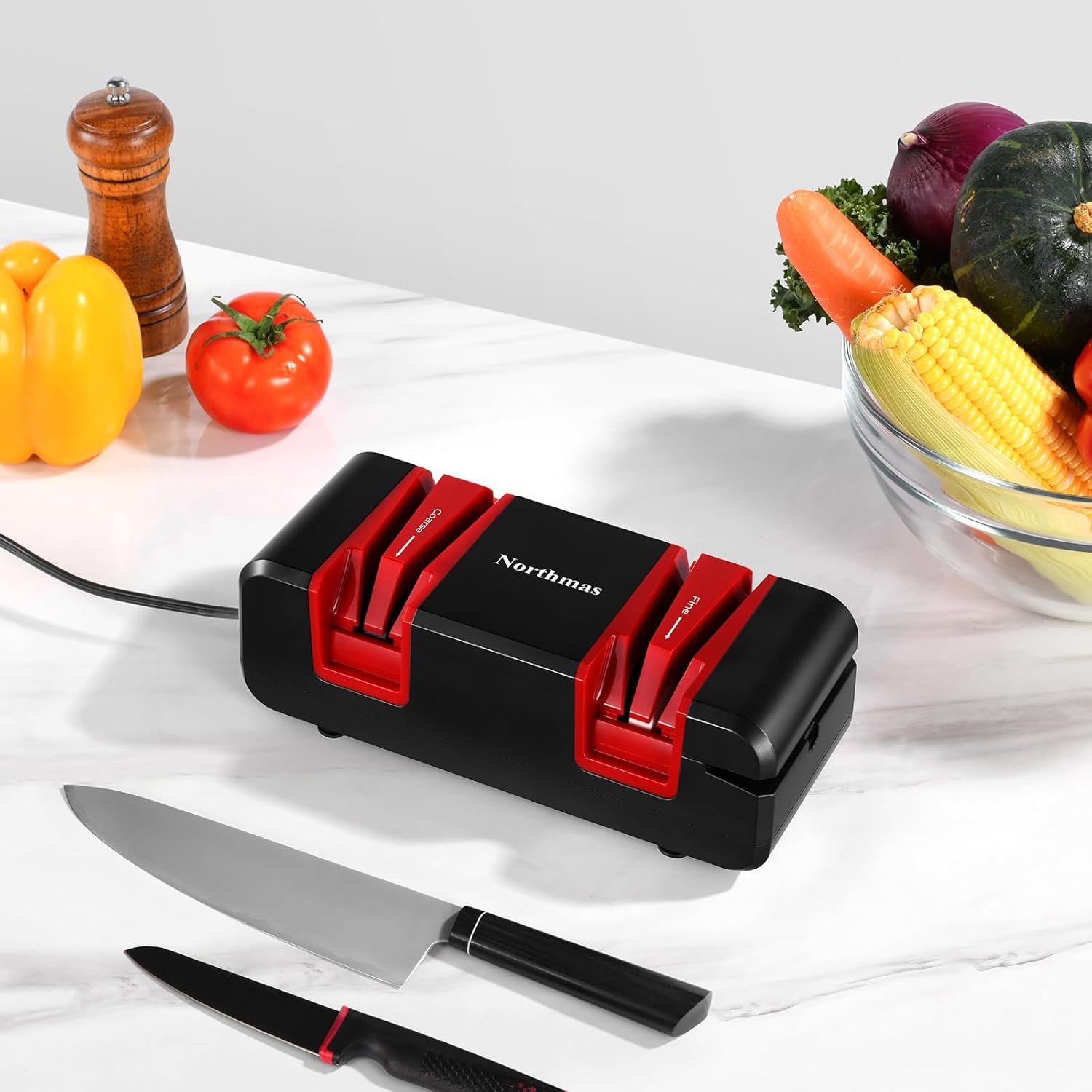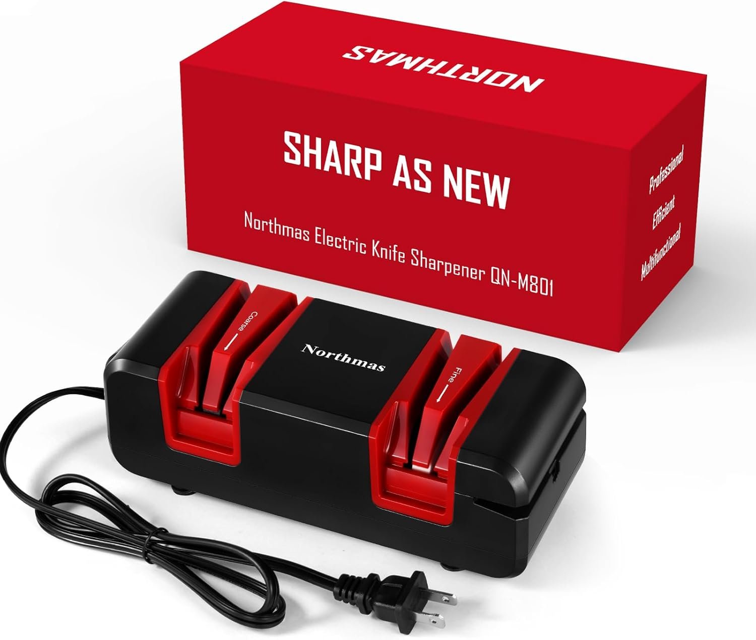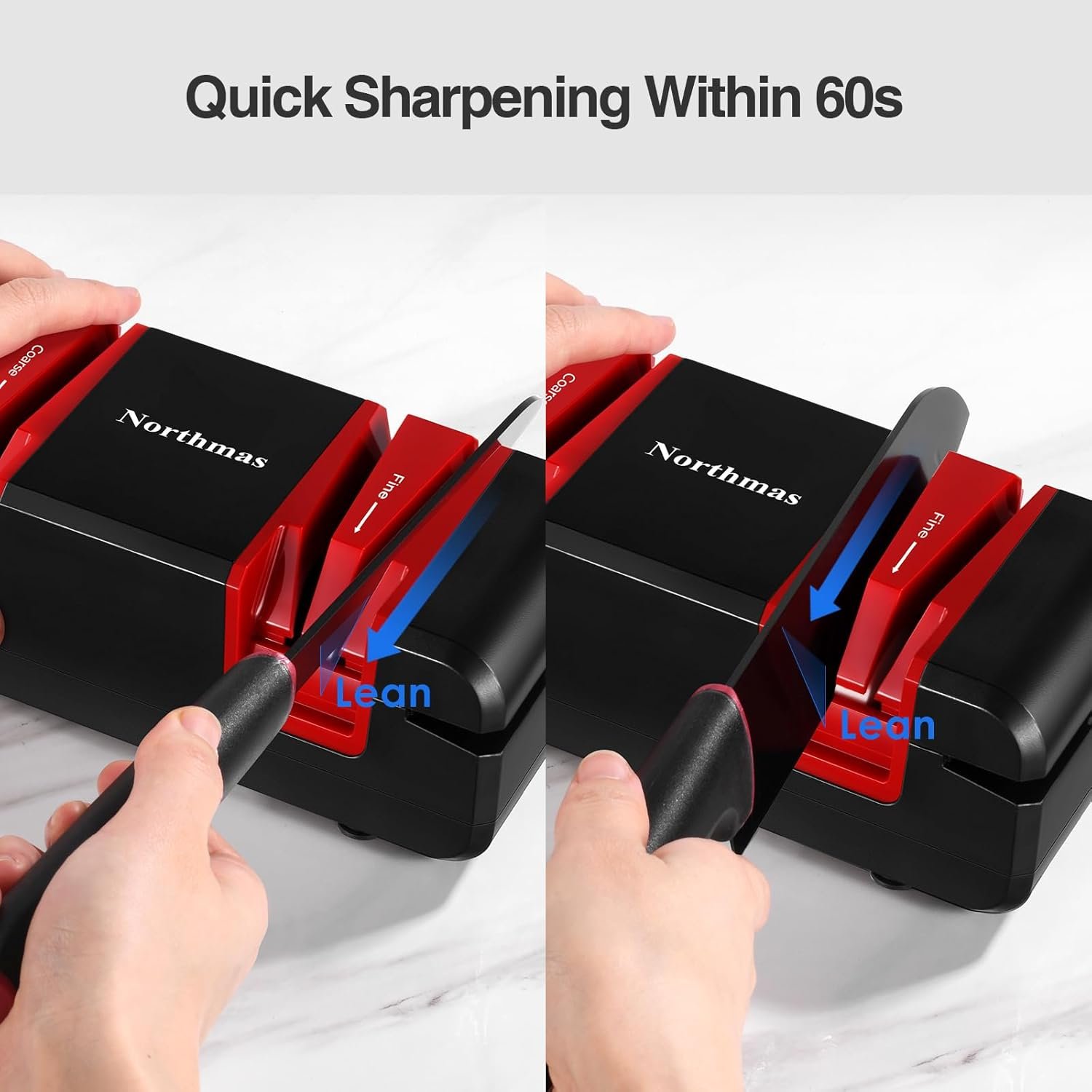 Professional Kitchen Knife Sharpener for Home – Northmas QN-M801 Knife Sharpener features a dual sharpening system for quick and efficient knife maintenance. The crude stage can sharpen knives quickly, and the fine stage can polish the edge more smoothly, delivering a sharp, burr-free edge. Experience restored knife sharpness in just seconds, perfectly meeting your edge maintenance needs.