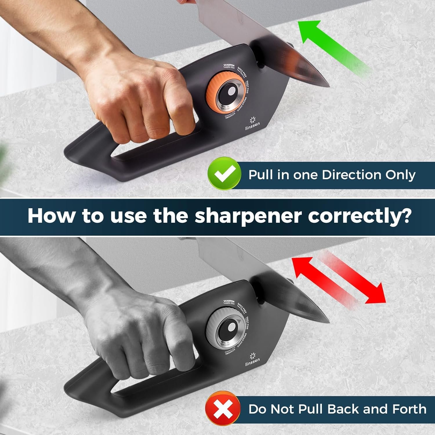 Easy to Use – The ergonomic handle ensures a comfortable and secure grip, suitable for both right or left-handed users. It features a safety grip to keep your fingers away from sharp blades and two non-slip rubber pads at the bottom for balance and stability. Simply place the blade in each slot and gently pull the knife through a few times for fast and effective sharpening. Avoid pushing the knife back and forth.