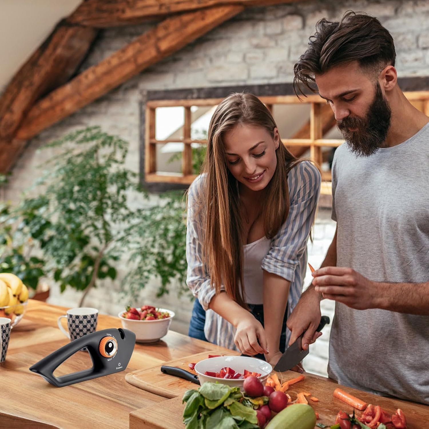 Innovative 5-in-1 Knife Sharpener – Sharpening knives is as easy as three simple steps. Use the “SHARPEN” slot (Tungsten Steel) to straighten and repair damaged blades, employ the “DAILY PREP” slot (Resin Diamond) to sharpen dull edges, and utilize the “DAILY FINE” slot (1000# Ceramic) for polishing. Additionally, two extra slots are designed for sharpening serrated blades and scissors. Keep your knives always in optimum condition.