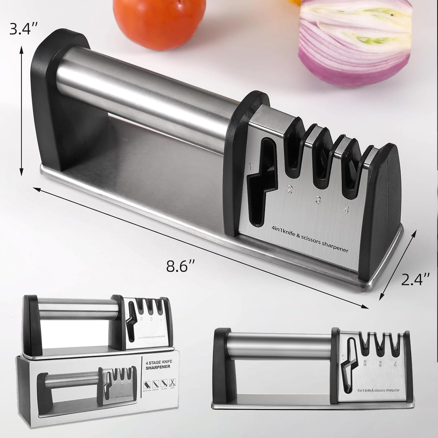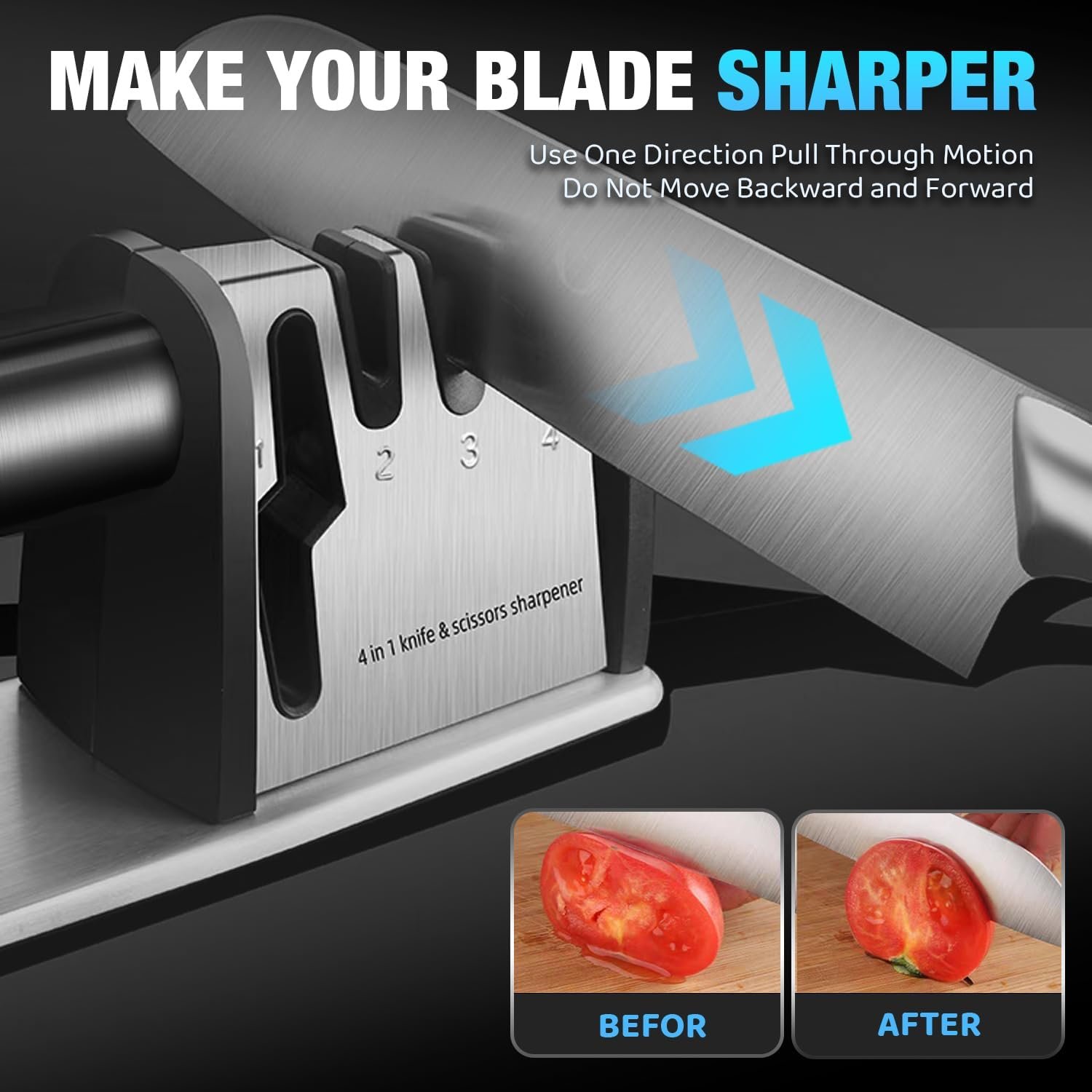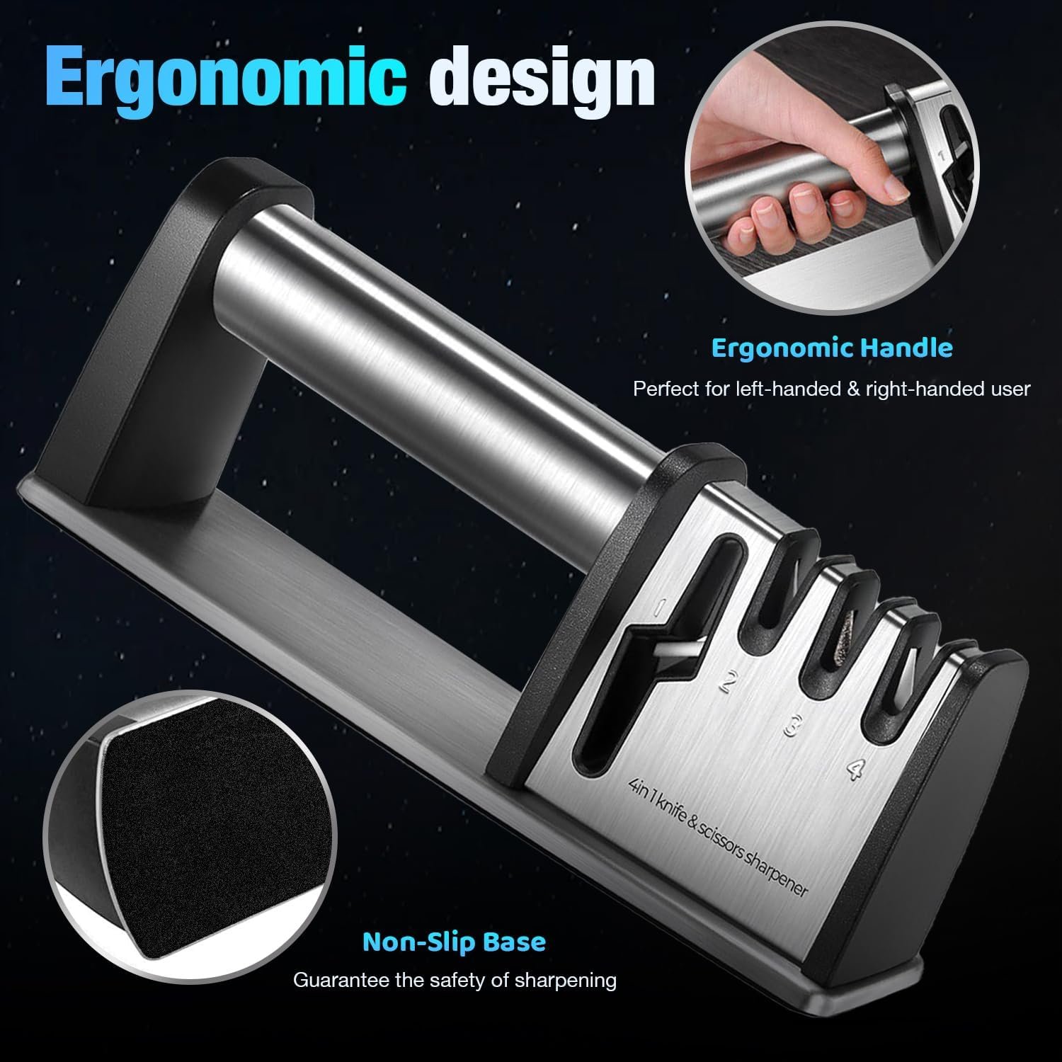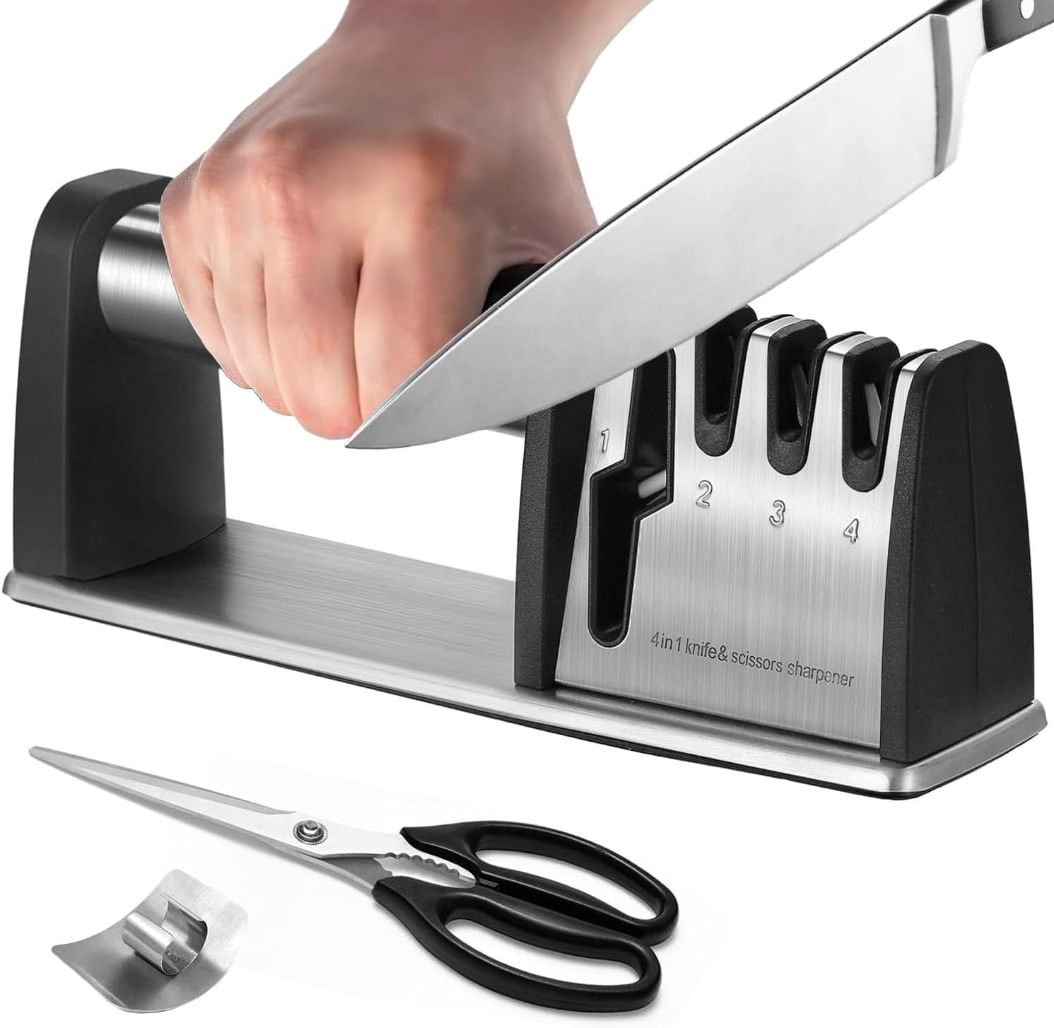 [ALL-INCLUSIVE KNIFE SHARPENER WITH 4- SLOTS]: Our knife sharpeners with 4-slots repairs your knives with varying degrees of bluntness effectively. Sharpen the scissors by scissors slot; Coarse slot is perfect for restoring the extremely blunt knife and blade re-shaping; While fine slot for daily sharpening; The last exact-grinding one for polishing and removing burrs.