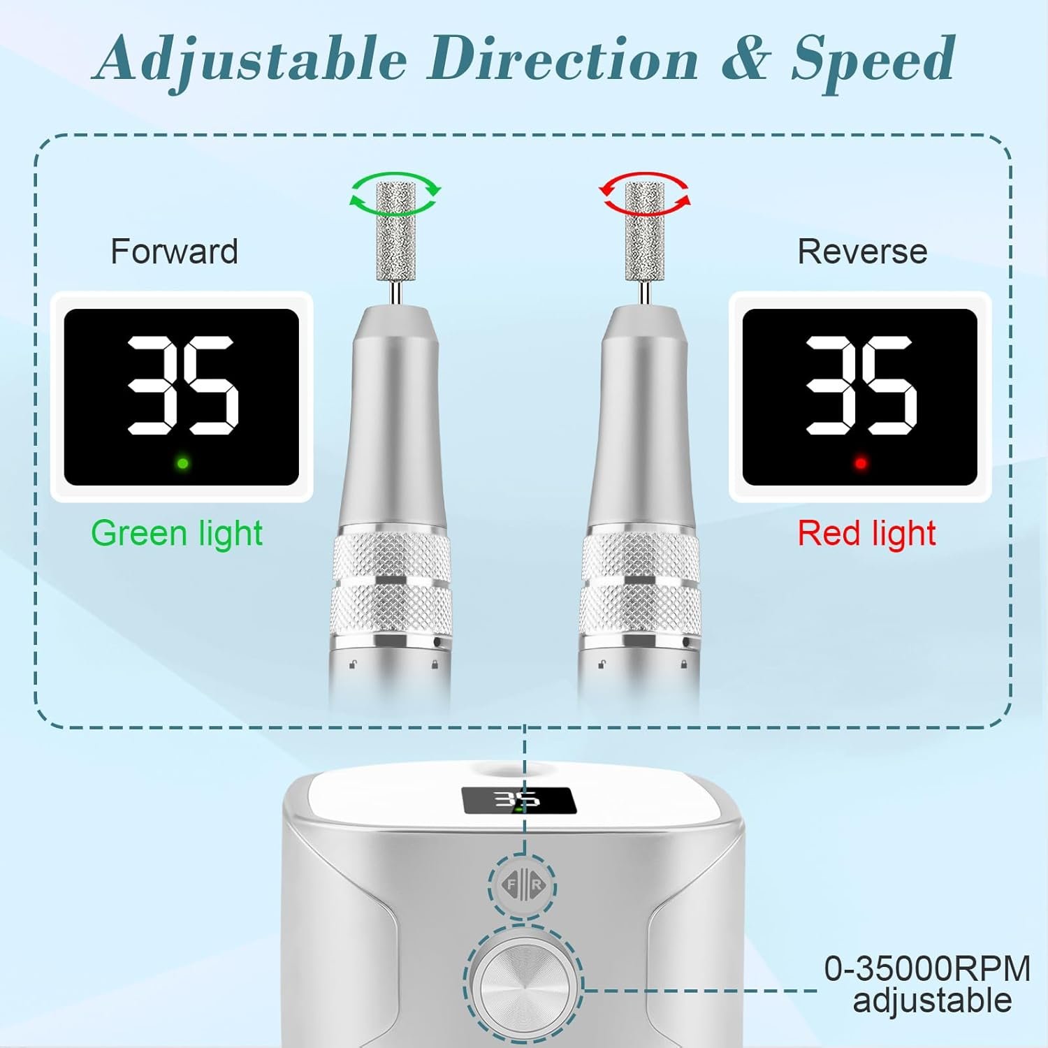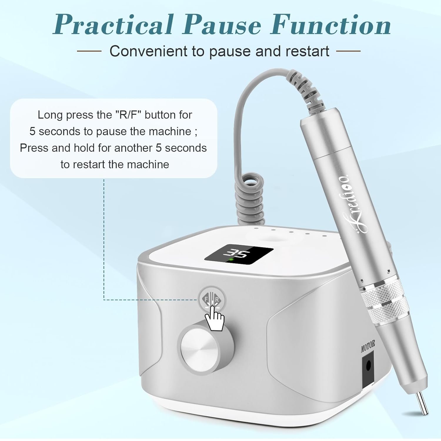 Easy for Beginners: This electric nail file is equipped with screen, R/F dual rotating direction, drill bits holder, and easy control speed knob. An extra pause function makes it easy to change bits without turning off the drill. Beginners can get hold of it quickly! With a screen showing the rotating directions and speed level, the working status is visible. No more struggling with manual nail files or clunky machines.