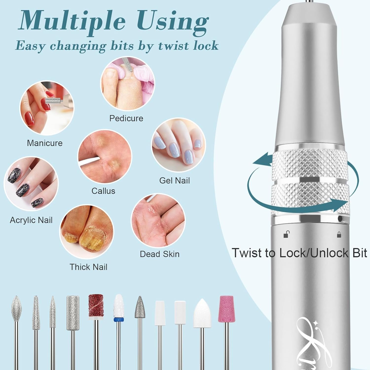 Twist Lock Changing Bits: Upgraded nail drill handpiece with twist lock system makes changing bits easy without pain. It fits with all standand drill bits of 3/32”. No worry that the mouth would become loose with too much pull in/out.
