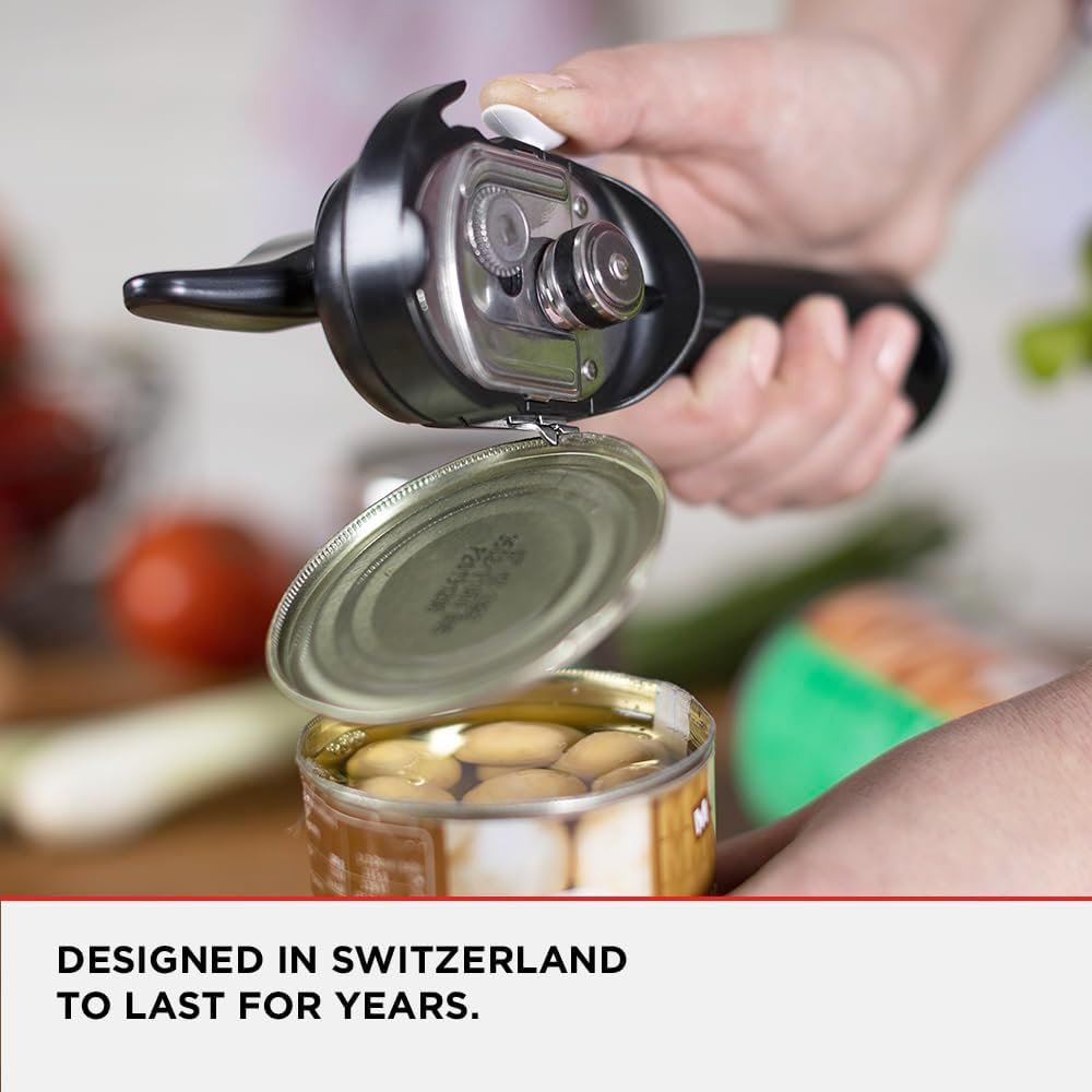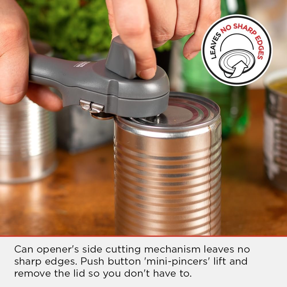 Our hip Auto Safety Master Opener makes opening cans, bottles and more clean, safe and fun. A super-handy version of our self-attaching Auto Safety Lid Lifter. Opens everything!