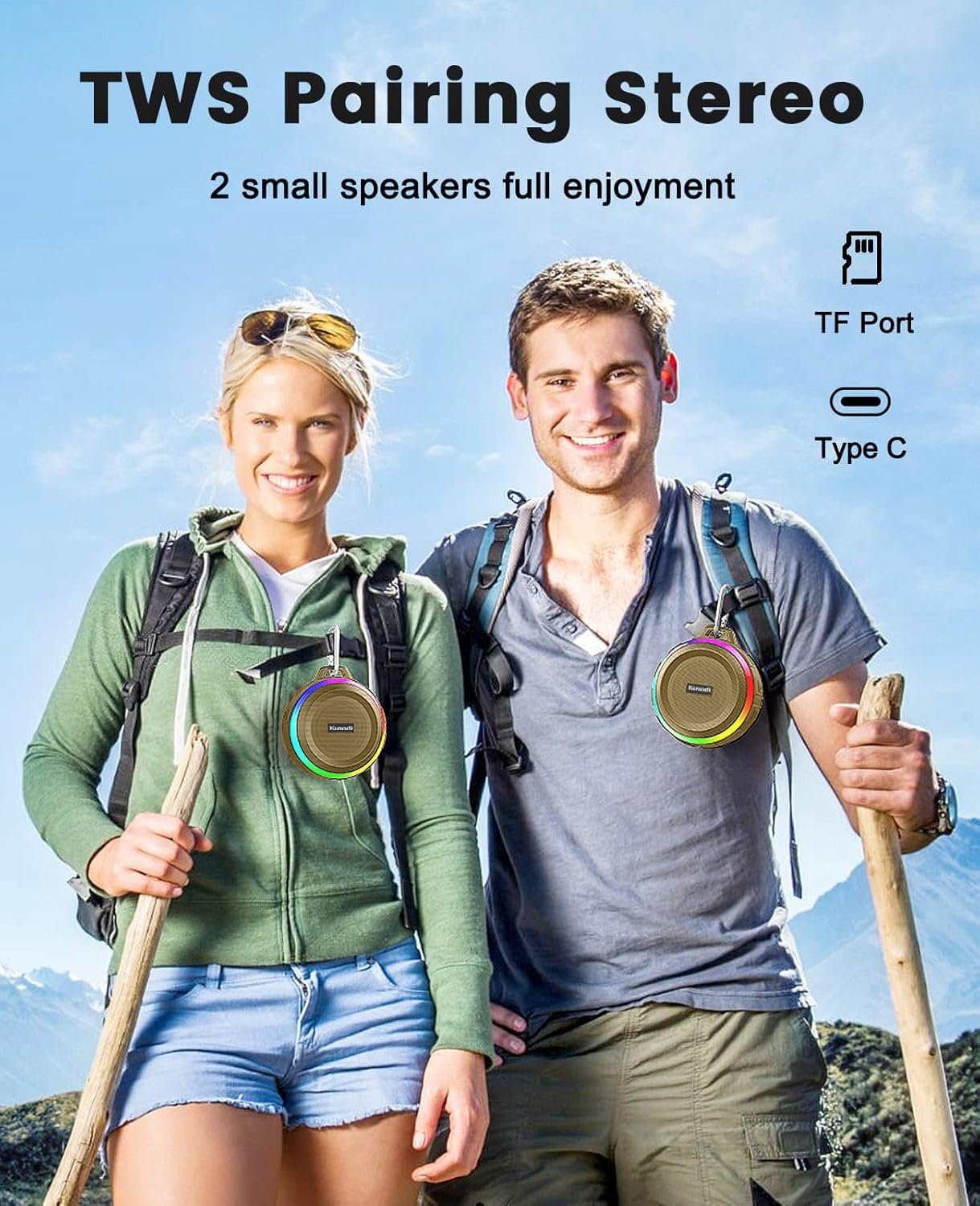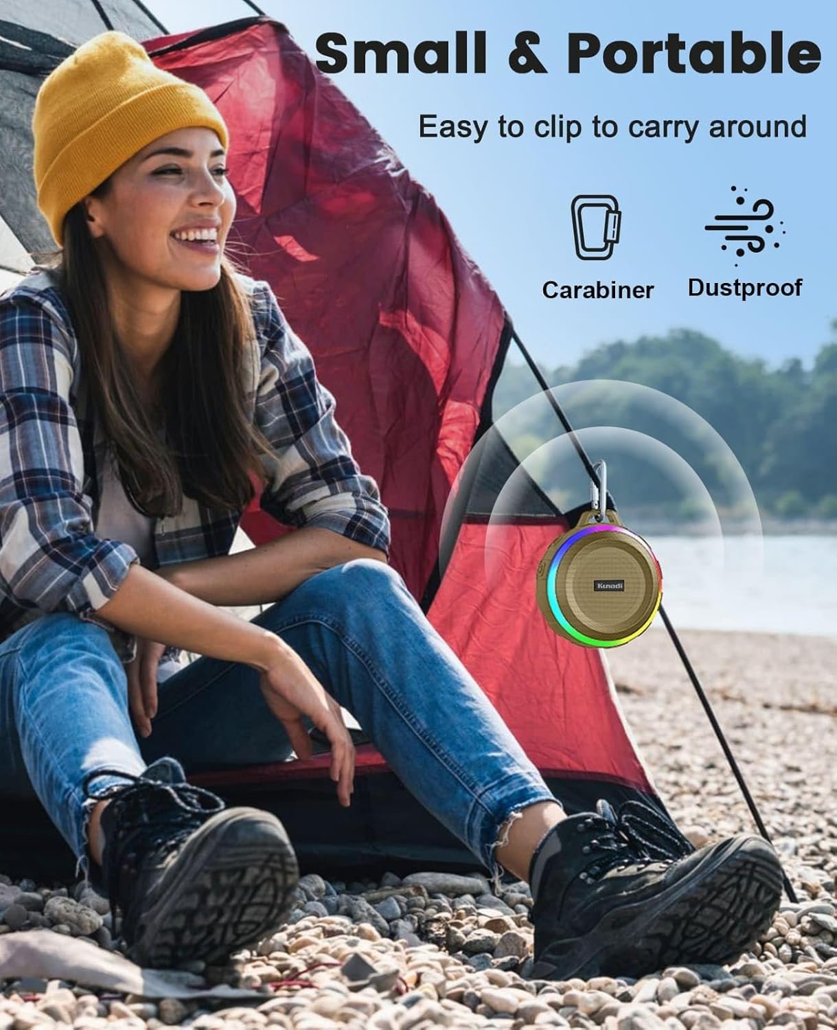 Portable & Clip on: Small compact size designed for the outdoors! Portable Speakers with reinforced carabiner. Suitable for backpack, bike, tent, golf, or hanging in the lot.