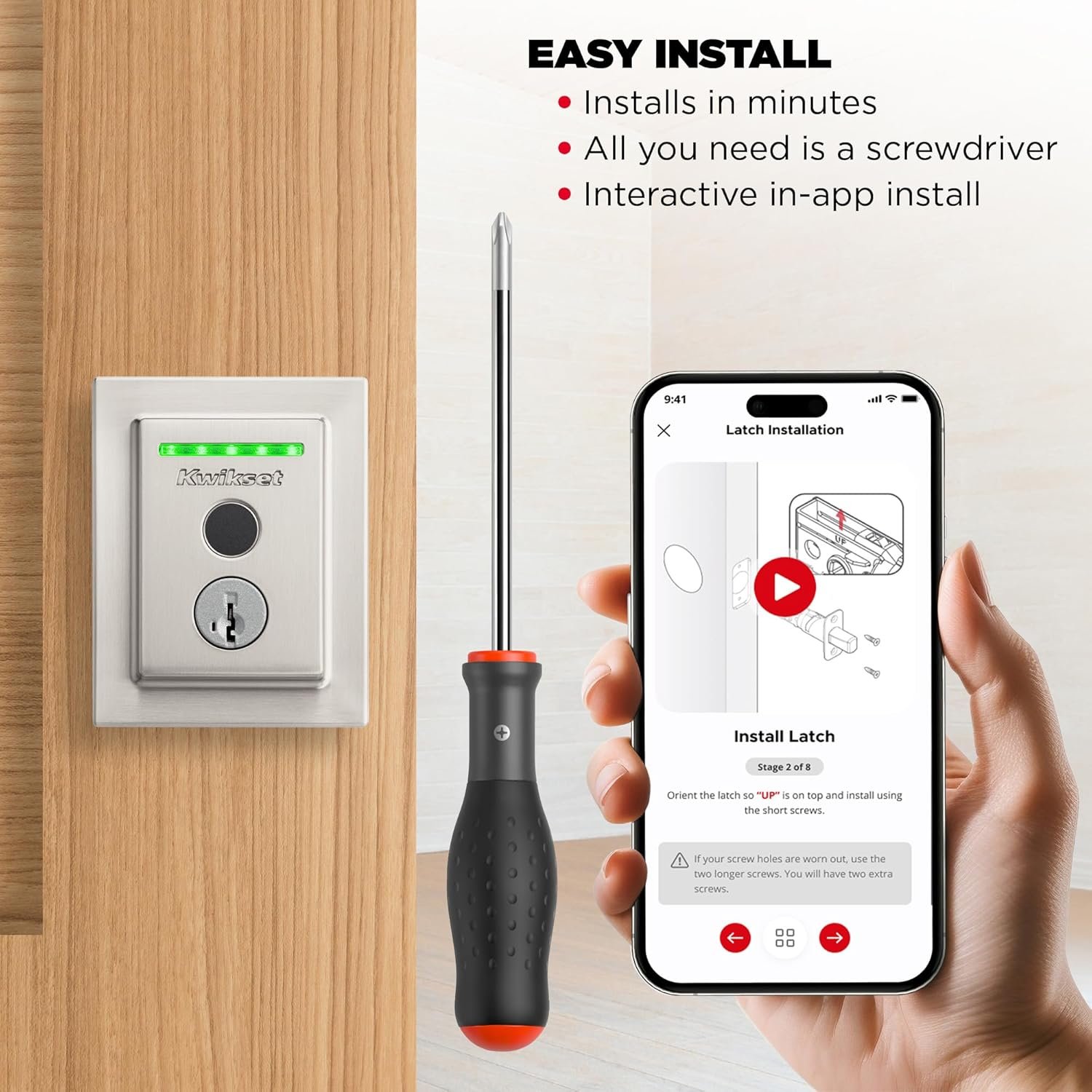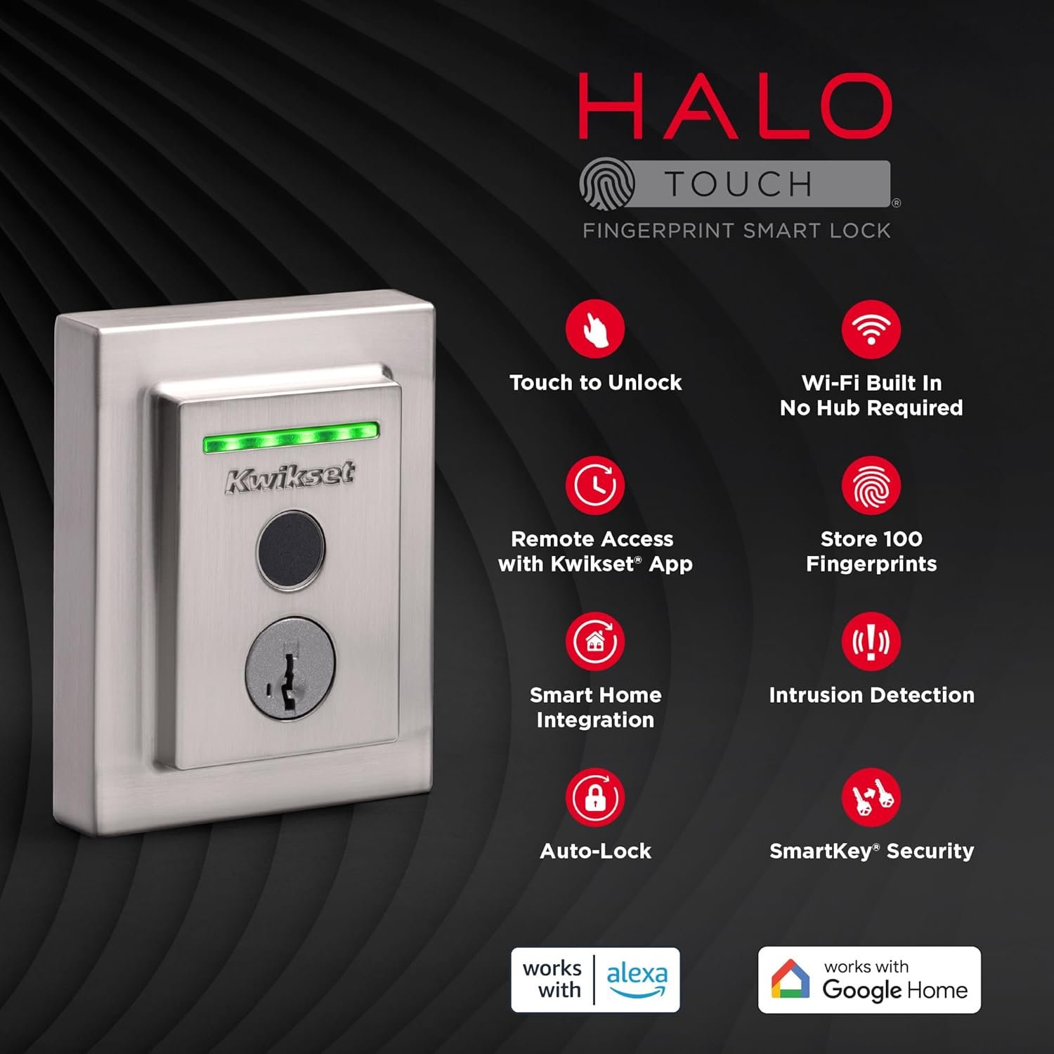 Unlock simplicity, connectivity and smart living with Halo Touch. Simply touch the reader to unlock the door. With the Kwikset app and Halo Touch’s built-in Wi-Fi, you can lock or unlock your home from anywhere. Keyless entry means you can ditch your keys, for good — unlock your door with the Kwikset app or use your fingerprint for quick, convenient entry. Store up to 100 fingerprints to simplify sharing access with family and trusted guests; real time notifications give you peace of mind they’ve locked up after leaving. Experience total control of your front door: Control your lock with your voice, check the event log any time and receive instant notifications for intrusion attempts. It’s easy to get started with Halo Touch; the guided setup and installation only requires a screwdriver. When it comes to security and access control, you can trust Kwikset’s 75 years of experience to deliver effortless protection and peace of mind.