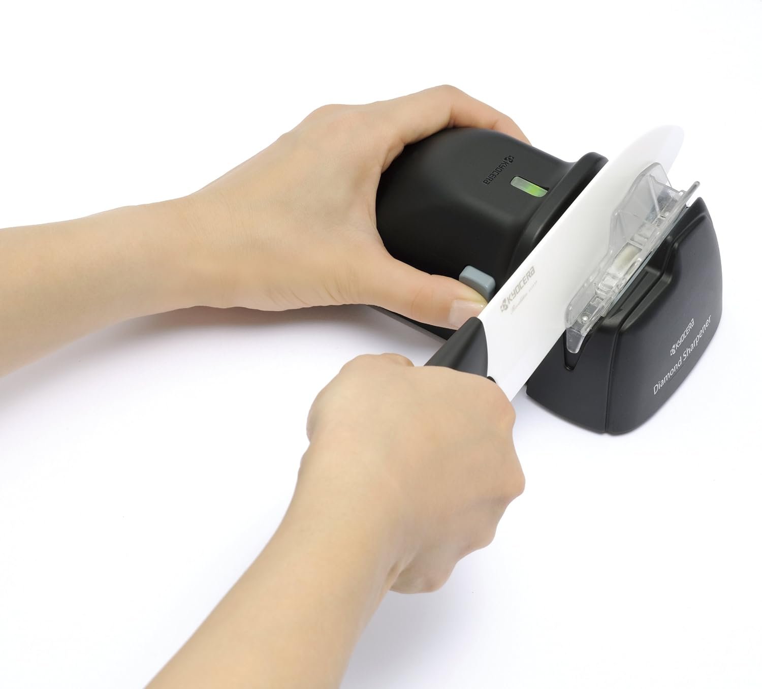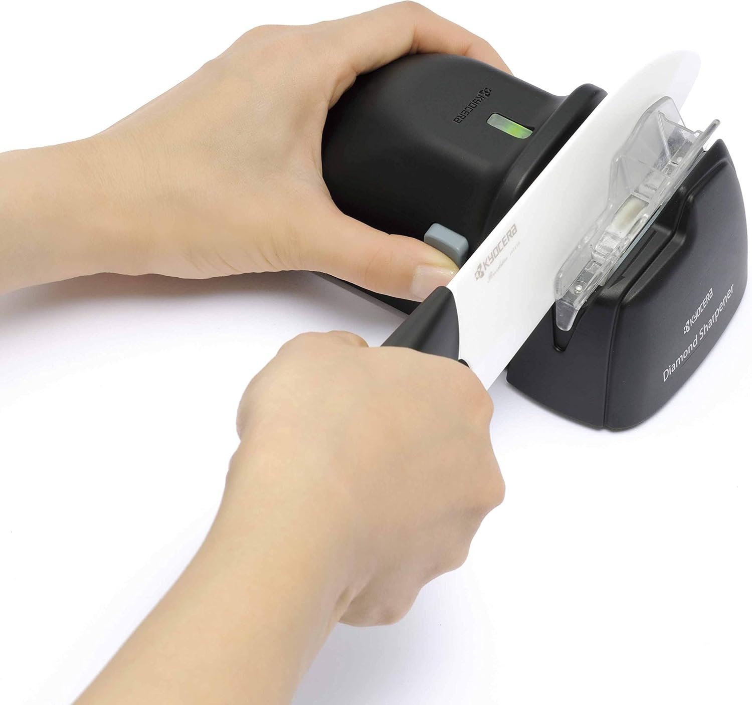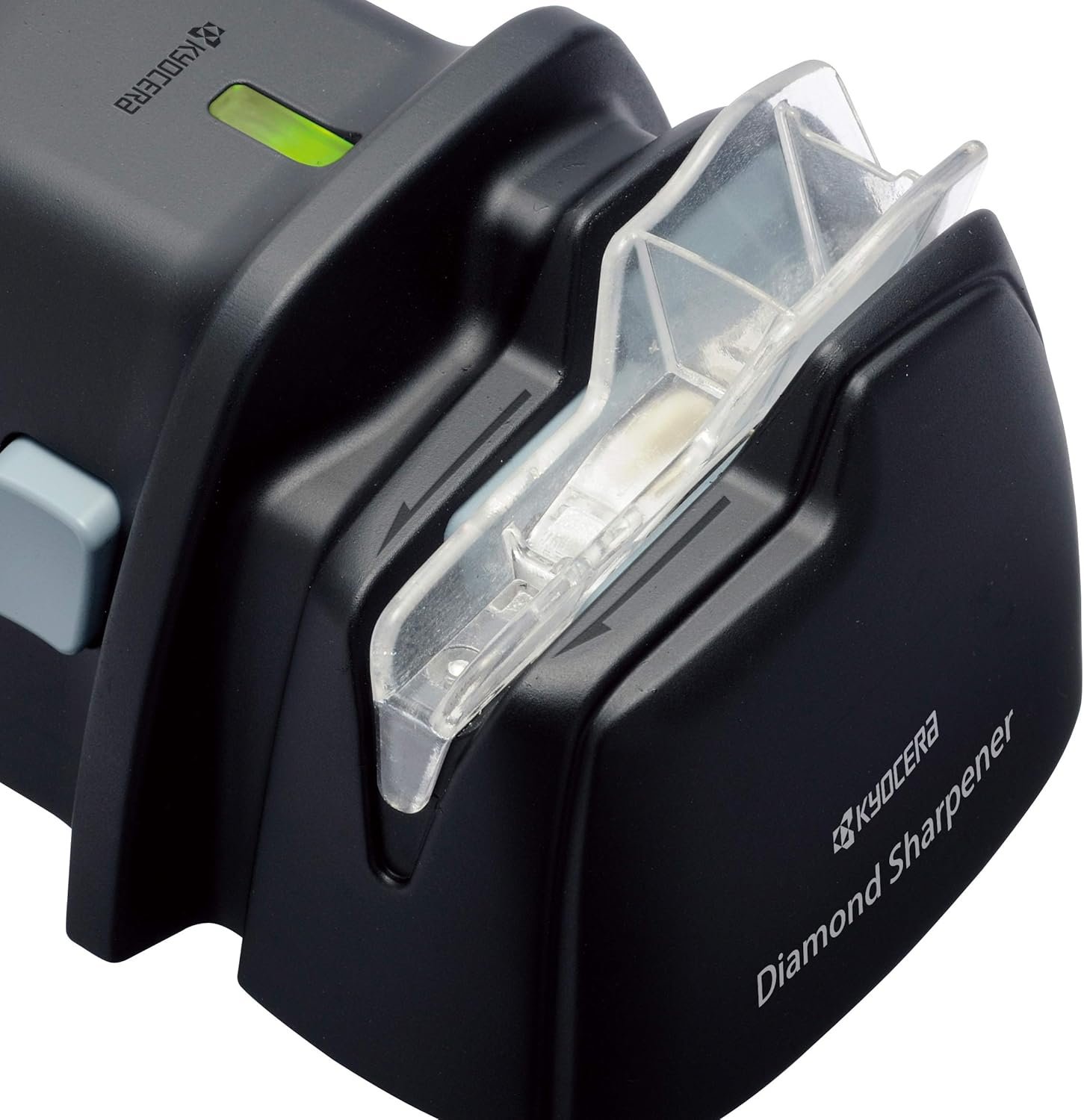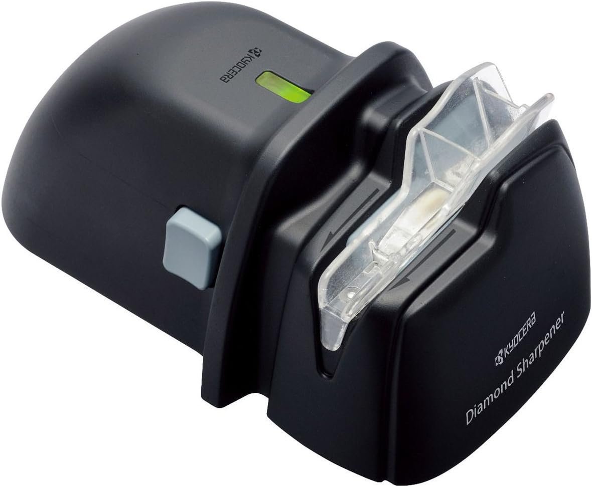 Kyocera’s battery powered diamond wheel knife sharpener is the perfect solution for quick, powerful and easy at-home sharpening of both Kyocera ceramic and steel knives. The diamond grinding wheel can remove ceramic chips up to .5mm deep refreshing a dull ceramic blade back to a smooth sharp edge. A convenient user-friendly knife guide slot, as well as an assist roller system provides precision controlled sharpening of the blade. Grinding dust is contained in a safety covered grinding compartment. For right handed use only.