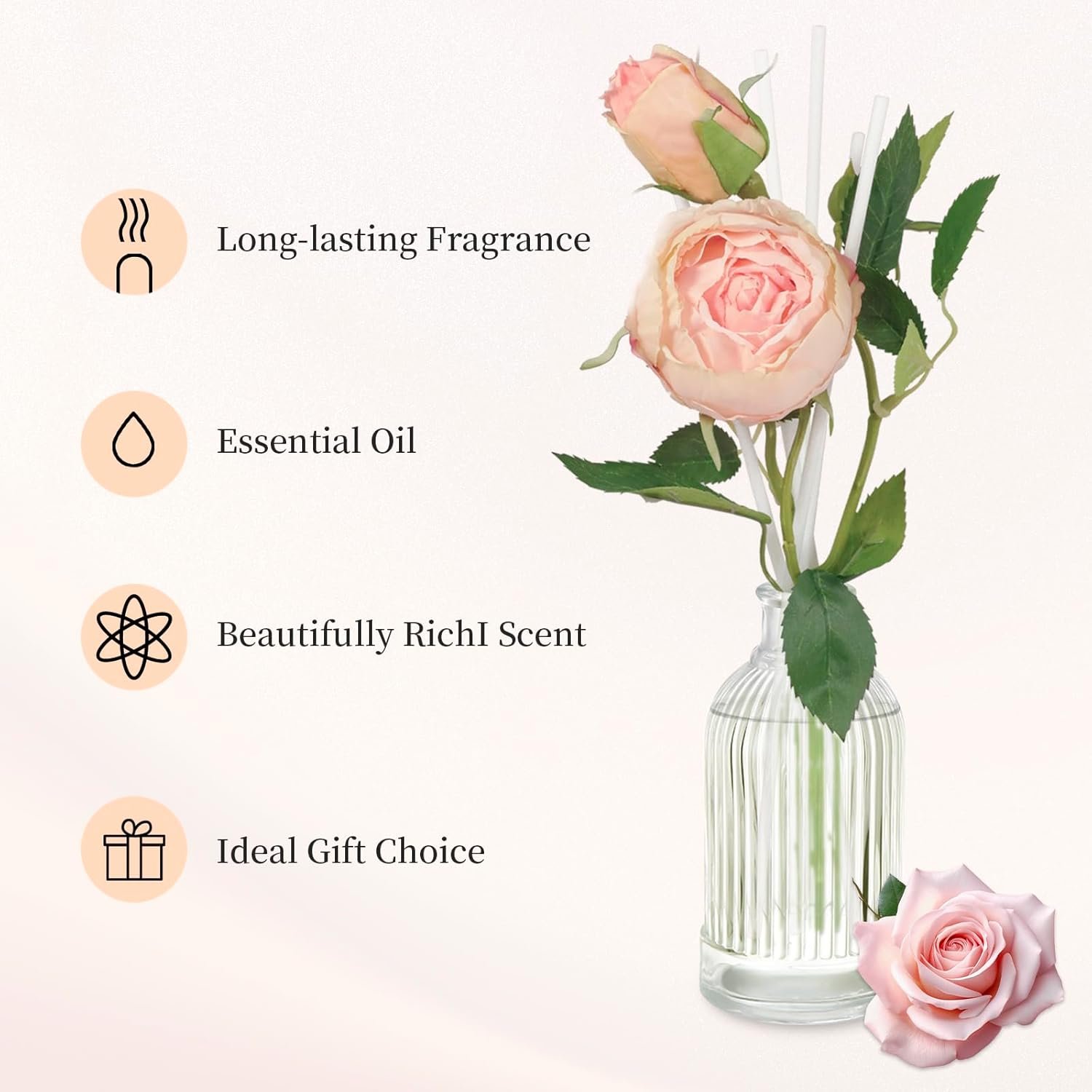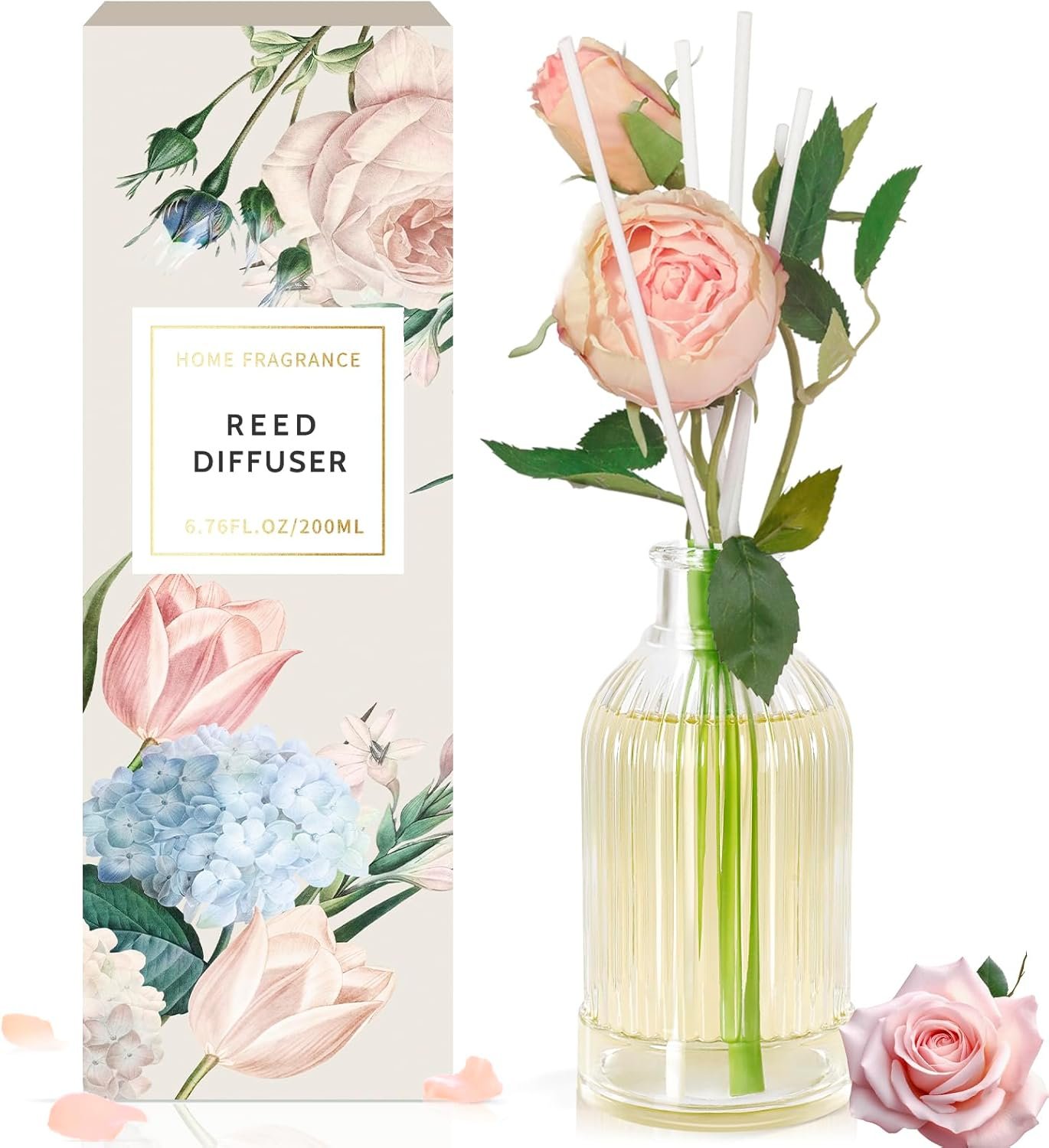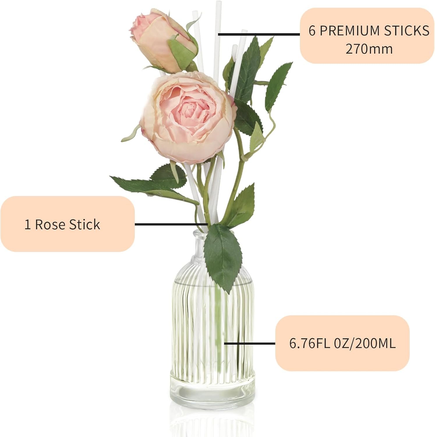 Delicate Floral Accents: A 6.7 oz of fragrance diffuser glass bottle and 6 of reed diffuser sticks, 1 stick of rose (artificial). These flowers not only enhance their visual appeal, but also provide a delightful sensory experience that can give your space a splash of bright color