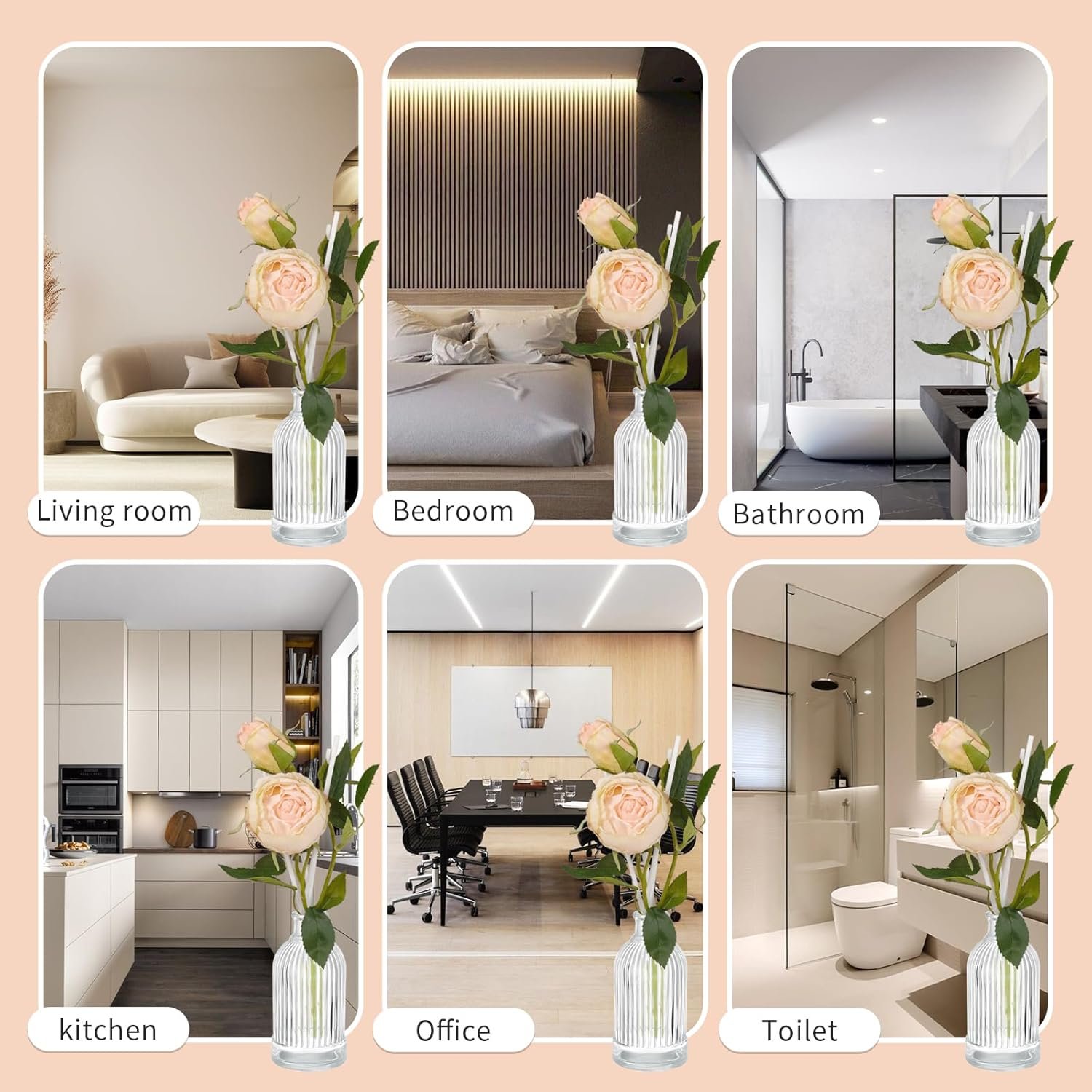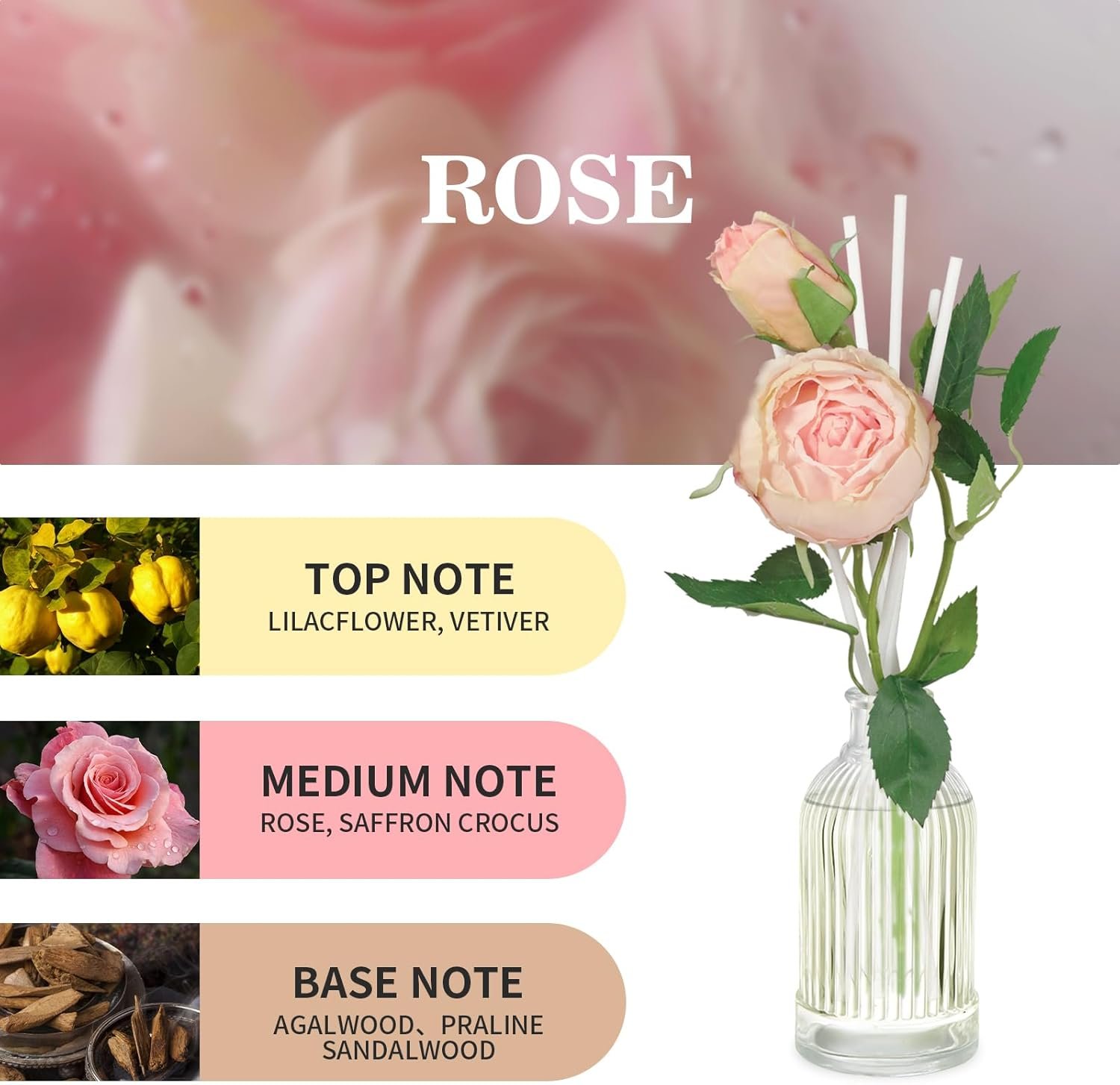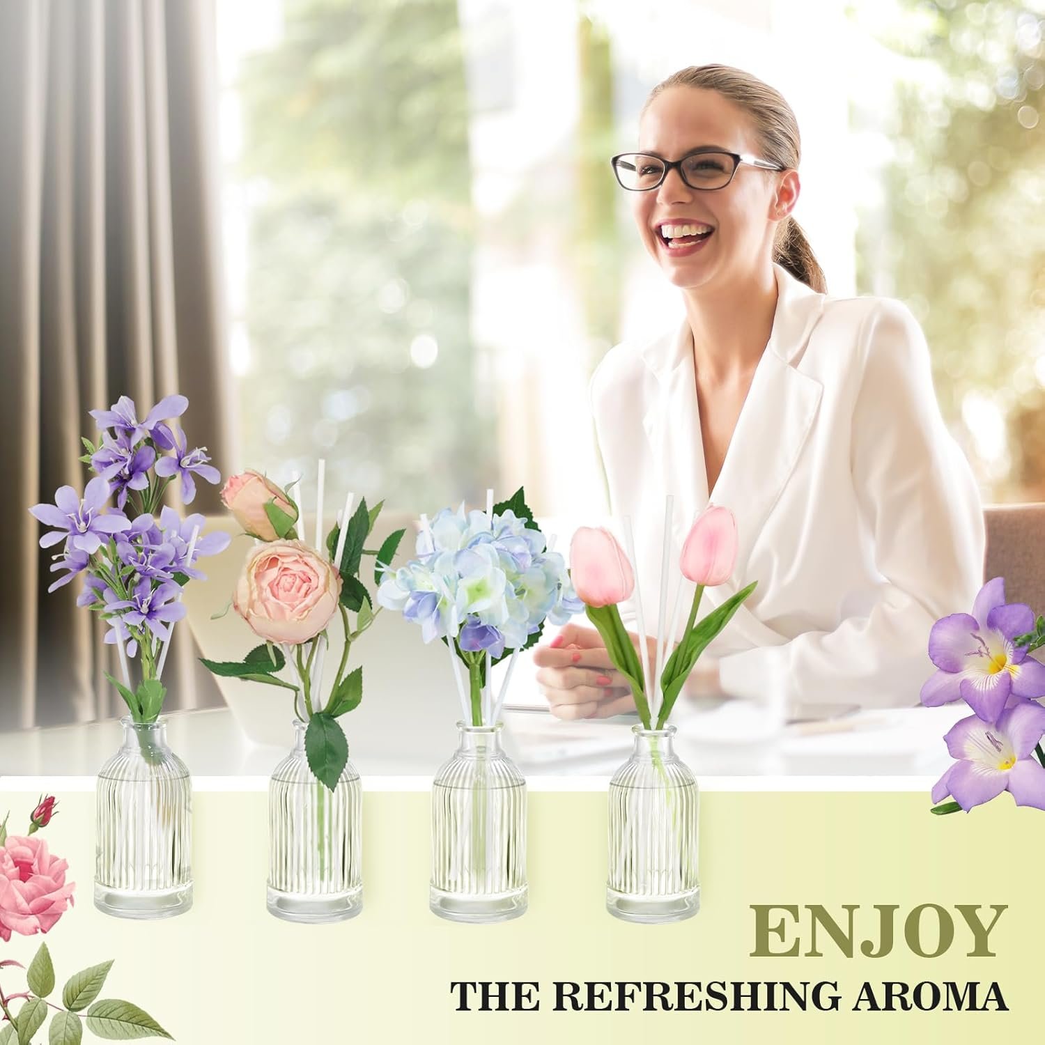 Delicate Floral Accents: A 6.7 oz of fragrance diffuser glass bottle and 6 of reed diffuser sticks, 1 stick of rose (artificial). These flowers not only enhance their visual appeal, but also provide a delightful sensory experience that can give your space a splash of bright color
