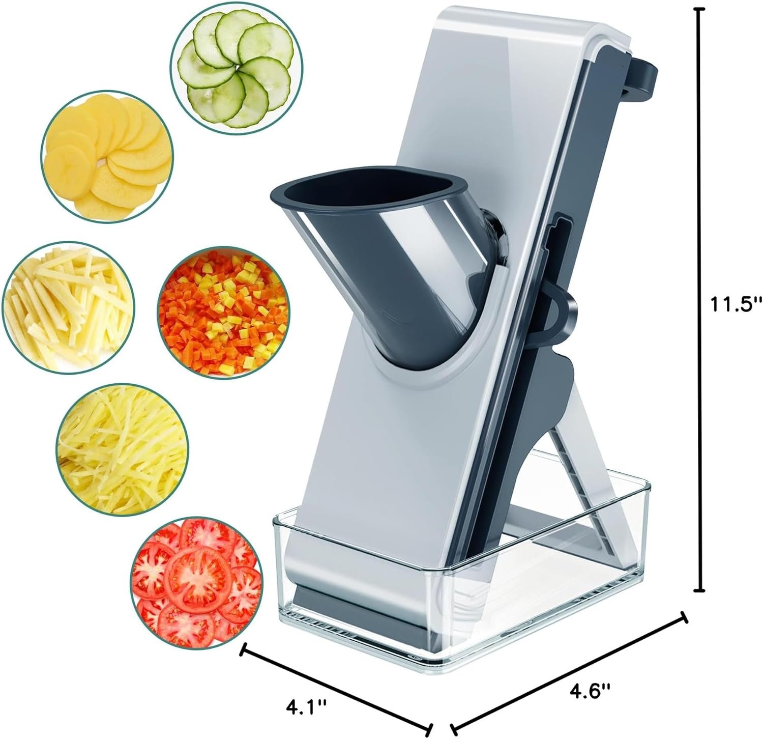Adjustable Vegetable Chopper: Equipped with interchangeable blades and a versatile cutting platform offering sizes from 2mm to 7mm, this vegetable slicer grater also functions as a convenient vegetable chopper. Effortlessly chop, slice, julienne, and dice a wide range of vegetables, simplifying your meal preparation.