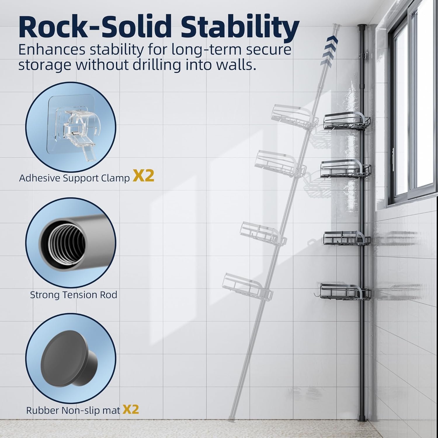 【Adhesive Support Clamps for Stability and Safety】The corner shower caddy tension pole uses a spring rod and two Adhesive Support Clamps to enhance stability without the need for drilling holes in your walls. This ensures stable, long-term secure storage. With a maximum load of 30 lbs per basket, you can press on heavy bottles like body wash without worrying about collapse. Enjoy a Tidy and safe space!