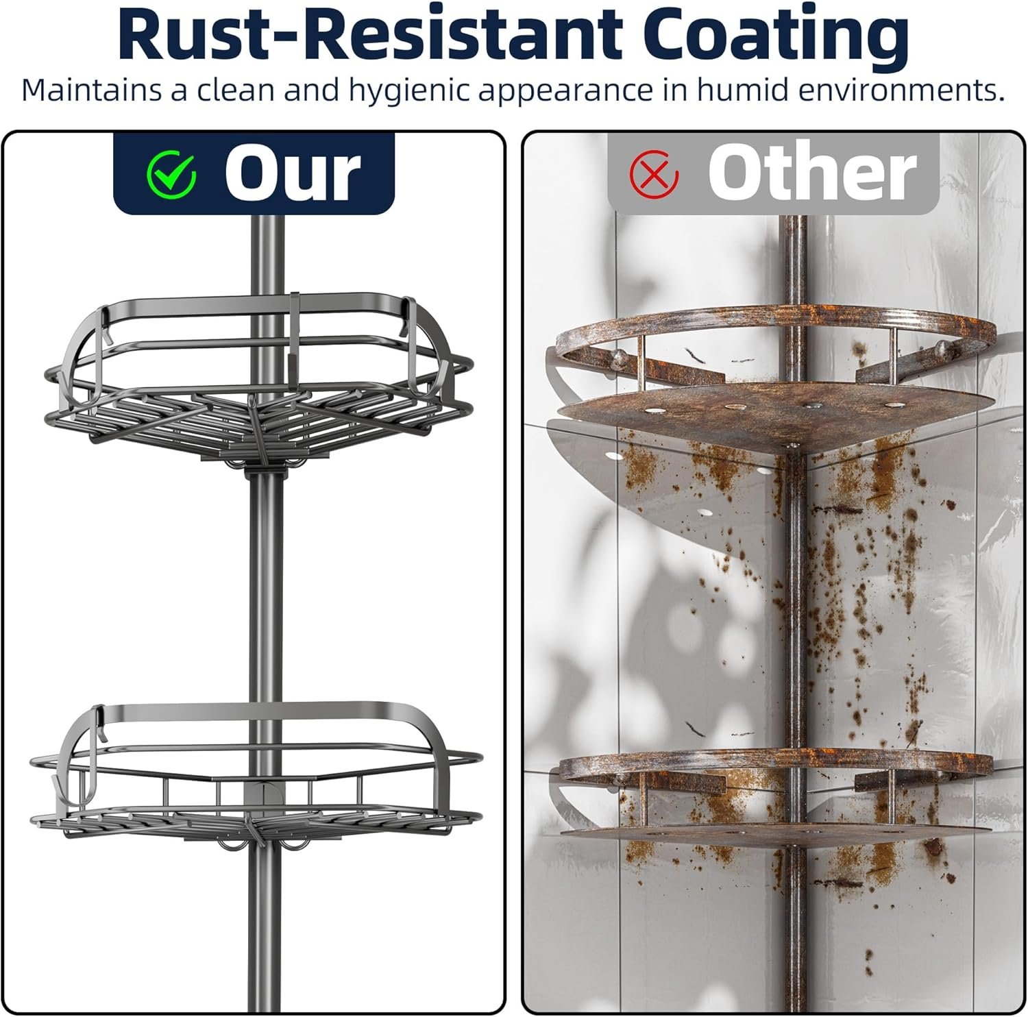 【Enhanced Durability with Thickened Steel】The shower caddy tension pole basket features a 3mm steel wire grid design, making it significantly more robust and durable than the common 1mm products and plastic options on the market. This ensures a longer lifespan and greater safety. Additionally, the shower corner caddy has an anti-rust coating, preventing rust even in humid environments, and maintaining a clean and hygienic look.