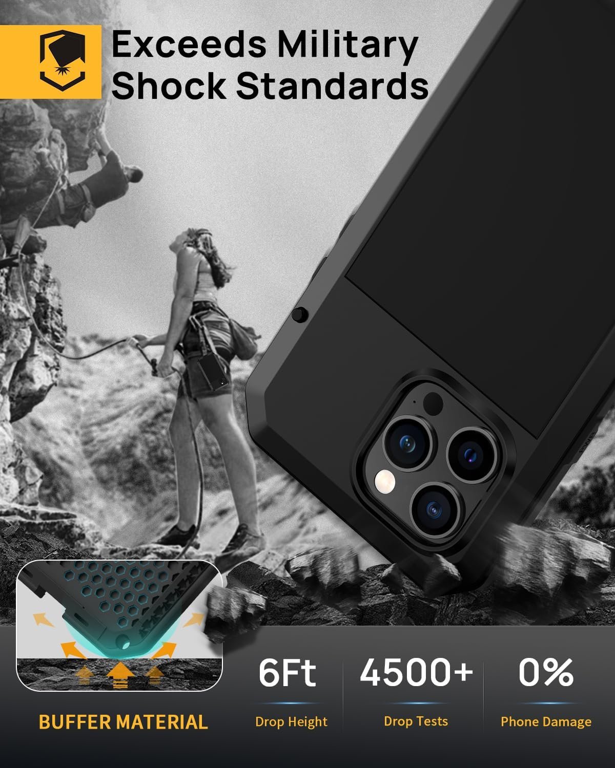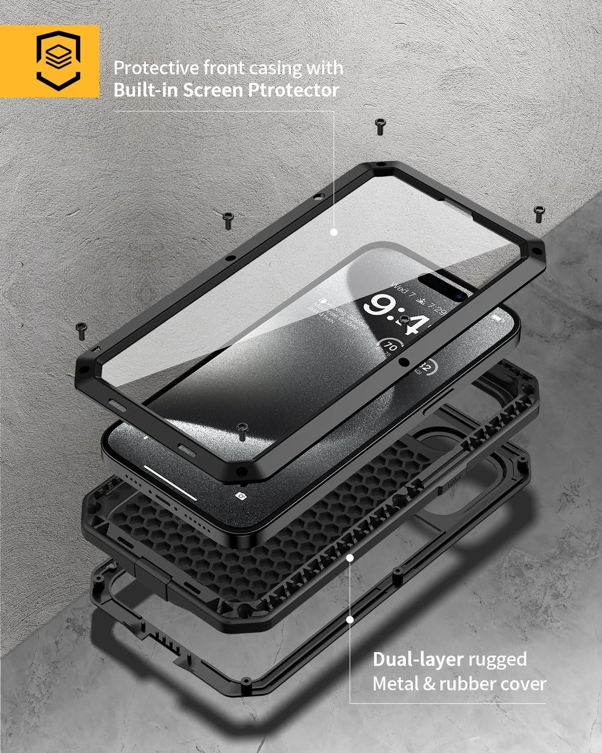 Double Layer Metal Case: A hard metal shell to prevent scratches, an inner soft bumper shell to absorb shock and withstand drops.