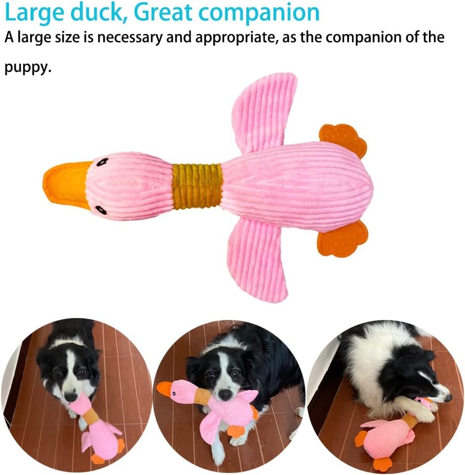 【Large duck companion】Every puppy needs a duck. The size is great for your puppy to hold to sleep. It has a squeaker in its head and crackly paper in its wings. It’s effortless to make sounds when your dogs play with it. The sounds can make your puppies very excited and keep them busy. Canvas duck bill, silicone duck feet, and flannelette body give your puppy three different chew experiences out of boredom.