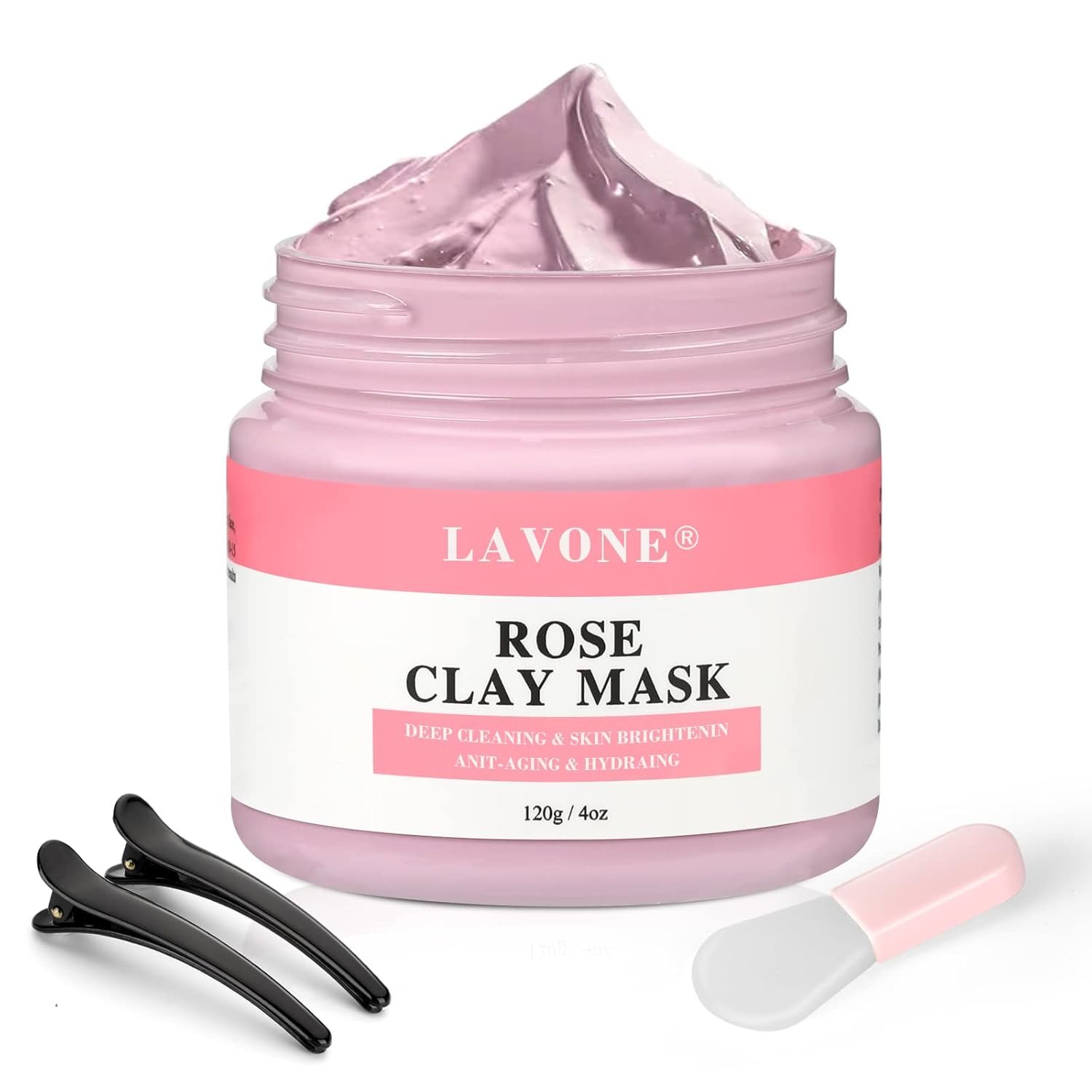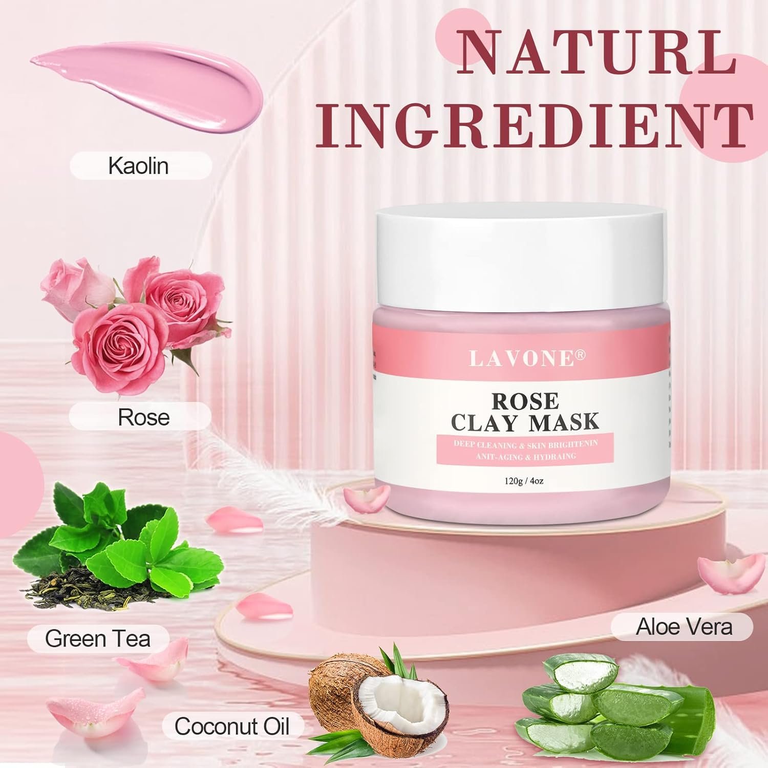 [Enhance and Improve Skin]: LAVONE clay mask rich in rose extact, green tea, vitamin A, vitamin E, coconut oil and aloe natural extracts. Enhances skin glowing, visibly brightens and hydrates skin, improves texture, fades dark spots, reduce ances, blackheads & repair scars.