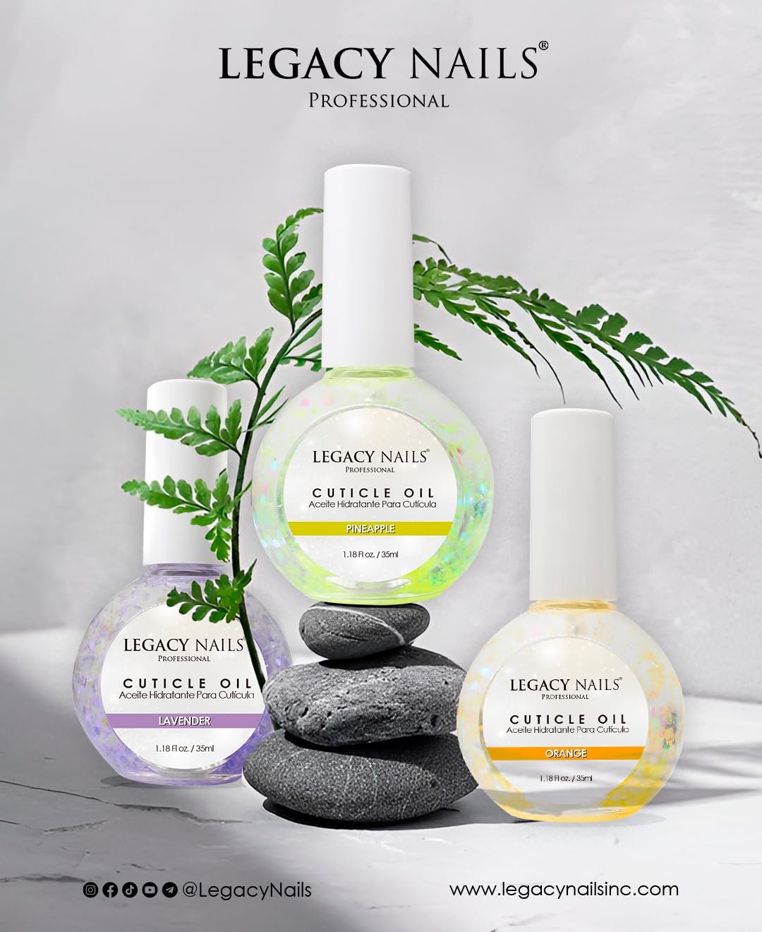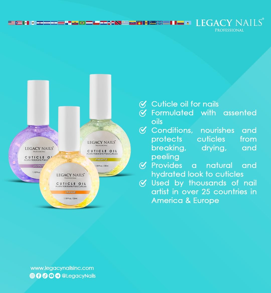 ✨ Legacy Nails HYDRATING CUTICLE OILS come in 3 presentations Lavender, Orange & Pineapple.