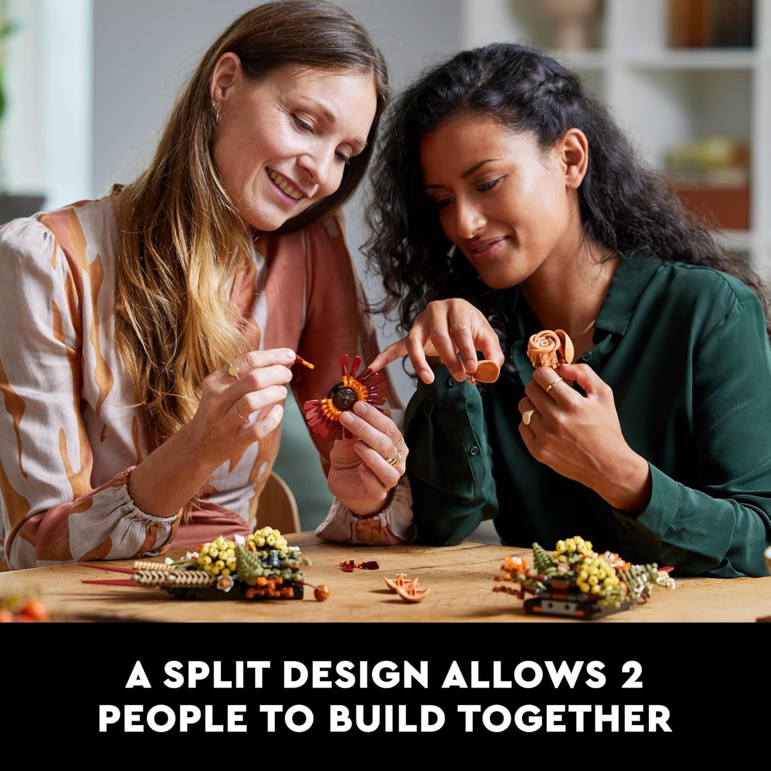Cultivate a piece of home decor that requires zero maintenance with this LEGO Icons Dried Flower Centerpiece (10314) craft sets for adults. An immersive building project, the artificial flower set is bursting with vibrant blooms inspired by the colors of autumn. This LEGO Icons flower set for adults features rose and gerbera as its focal point. Once it’s complete, you can use it as a striking table centerpiece or hang it as flower wall decor to create a floral display to cherish forever. The buildable model has a split design that allows 2 people to construct it at the same time, providing the perfect way to spend quality time with a friend or family member. You can also use the LEGO Builder App to store instructions as well as view, zoom and rotate your creation as you build the real model. Part of the revolutionary LEGO Botanical flower and plant Collection for adults, this buildable model set includes several elements made from plant-based plastic produced using sustainably sourced sugar cane and makes a unique flower gift idea for adults who love arts and crafts activities. This product measures 7 cm (3 in.) high, 40 cm (16 in.) wide and 13 cm (5 in.) deep. Contains 812 Pieces.