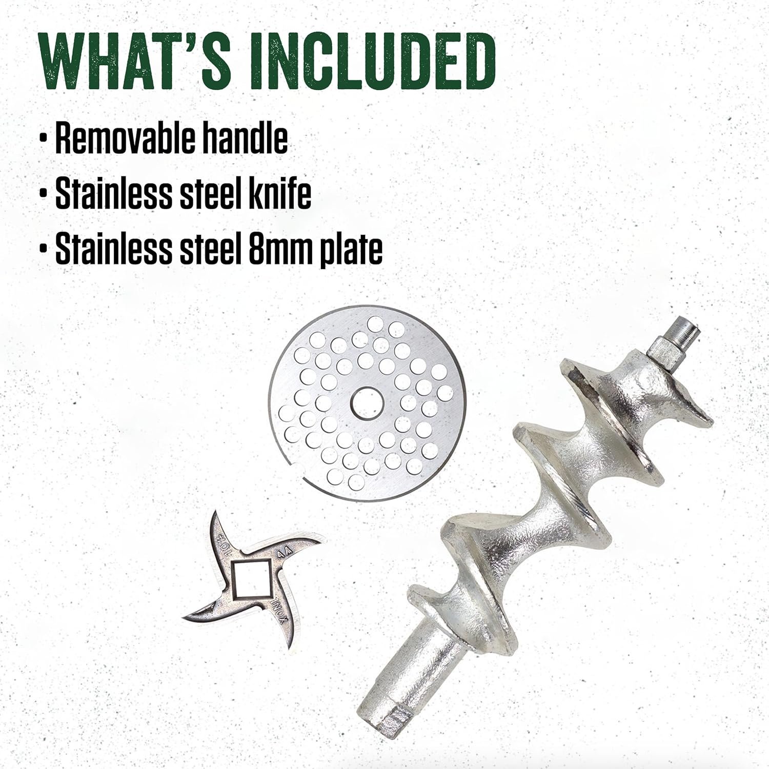What’s Included: Our meat grinder comes with a stainless steel knife and an 8mm stainless steel grinding plate.