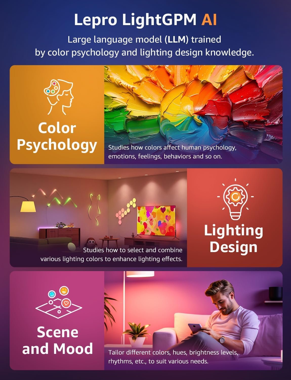 Lepro AI LightGPM 2.0 – Professional Lighting Made Easy. Lepro LightGPM is a large language model trained on color psychology and lighting design knowledge, allowing you to create professional lighting effects without needing to learn these skills yourself.