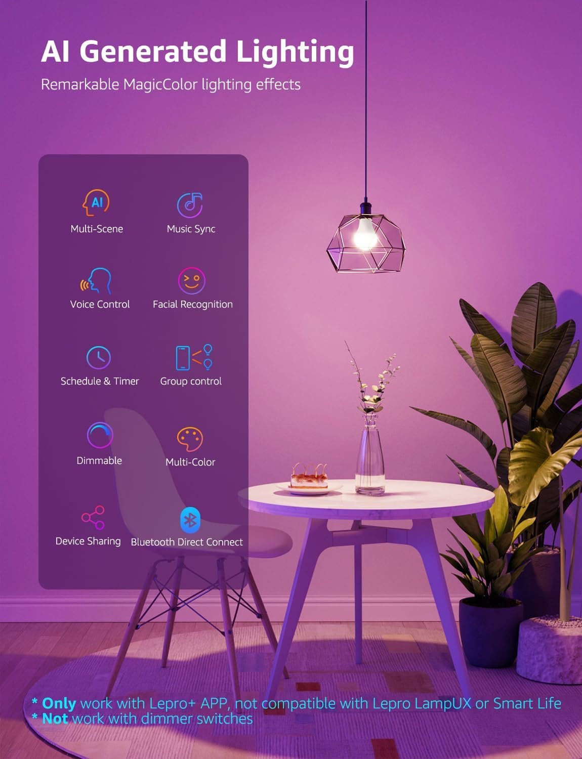 Lepro+ Smart APP Needed – You can unlock various features to personalize smart LED bulbs via the Lepro+ App, adjust the colors and brightness to your preferences. Enjoy seamless convenience and create delightful moments with ease.