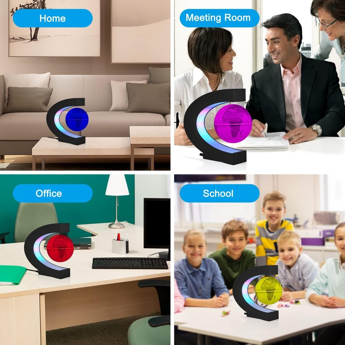 Multi-Color changing LED globe comes with C shape colorful LED frame base. At night, the color of the globe changes alternately in blue, green, purple, yellow, pink and red etc multi-color when the globe levitated.