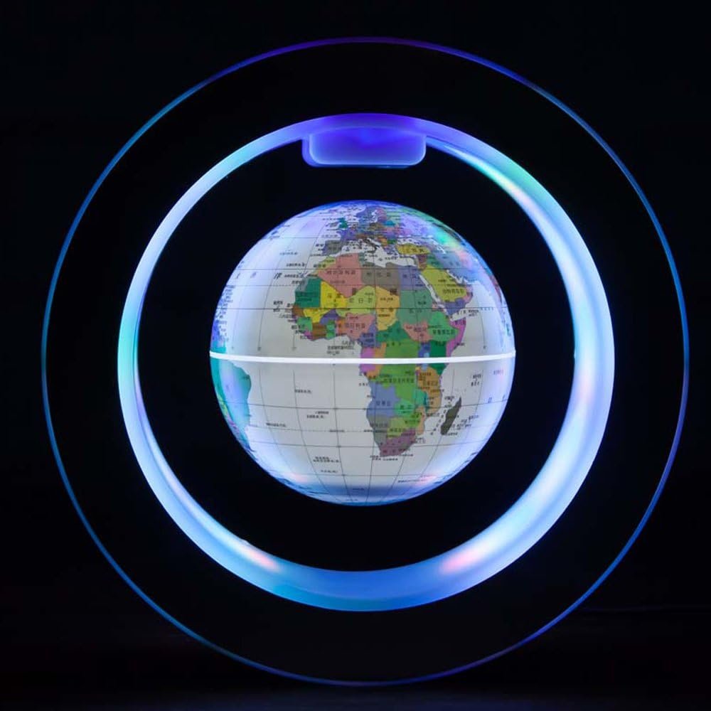 The O-shaped frame is inlaid with several coloured LED lights, and the lights illuminate the rotating globe floating in the middle.