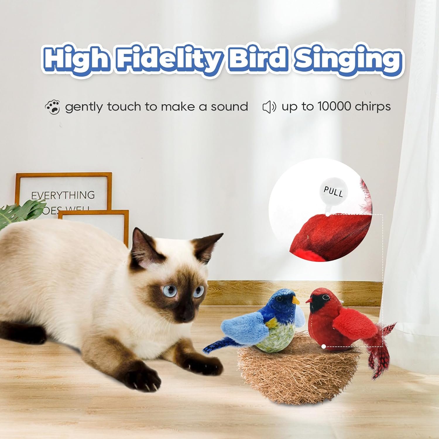 Chirping Birds: Two red and blue colored tits can emit a realistic bird song when touched, stimulating the cat’s hunting instinct and beckoning every pat, bite, chew, and chase
