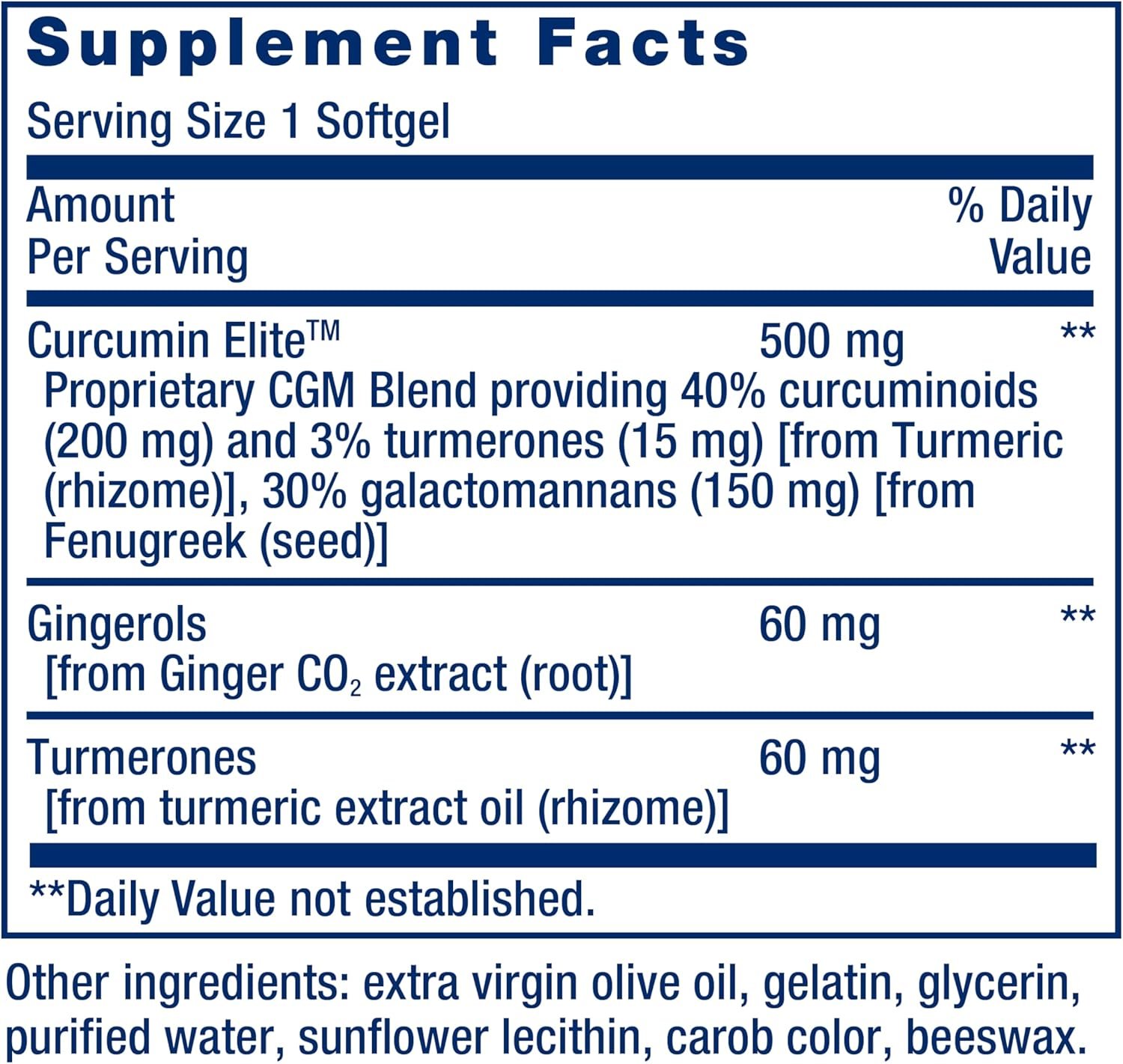 Advanced Curcumin Elite™ Turmeric Extract, Ginger & Turmerones is a turmeric supplement with over 45 times more bioavailability of the active forms of turmeric compounds that you need to support a healthy inflammatory response and encourage whole-body vitality. This supplement is augmented with complementary ginger and turmerone extracts to create our best-in-class curcumin formula for a healthy inflammatory response, cardiovascular health, brain health and immune response. Advanced Curcumin Elite™ turmeric and ginger supplement has 30 gluten-free softgels, enough for a one-month supply. This formula is made with 100% non-GMO ingredients.