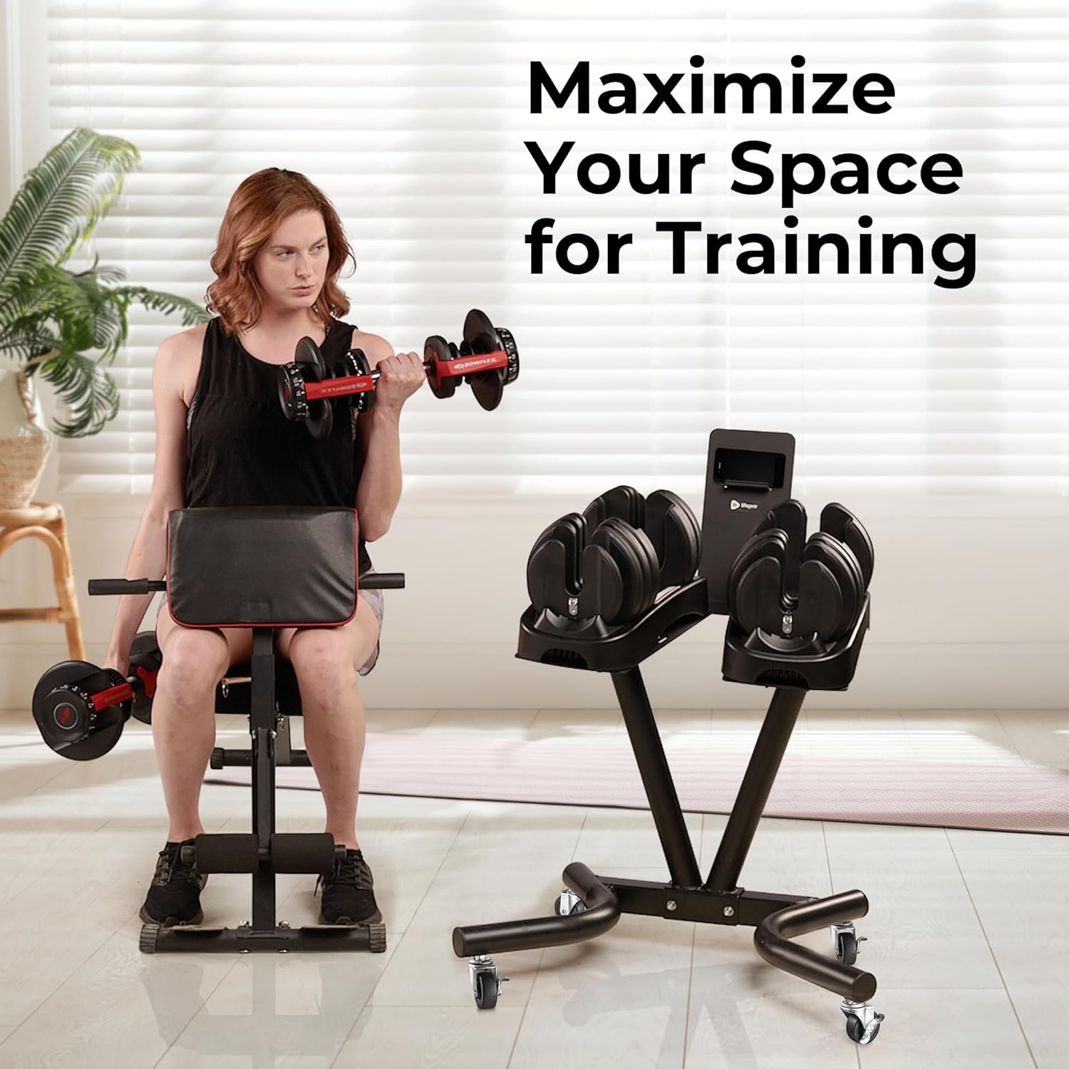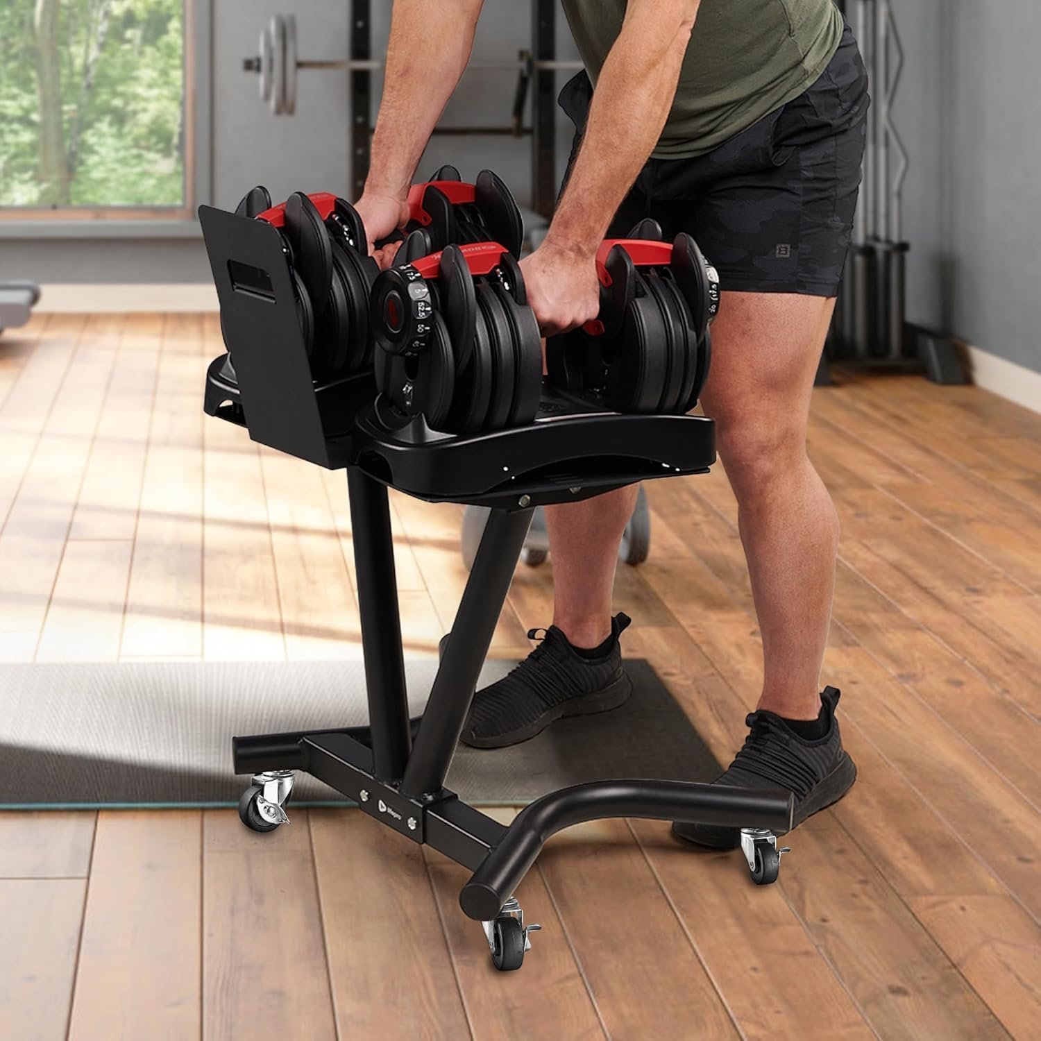 NEW UPGRADED Wheels & Frame – Experience enhanced durability with upgraded metallic casters of wheels, replacing plastic for improved resilience, capable of supporting up to 220 lbs. The PowerFlow adjustable dumbbell stand is built with robust Ø50mm × 1.5mm powder-coated steel and reinforced with galvanized steel hardware for lasting strength and stability.