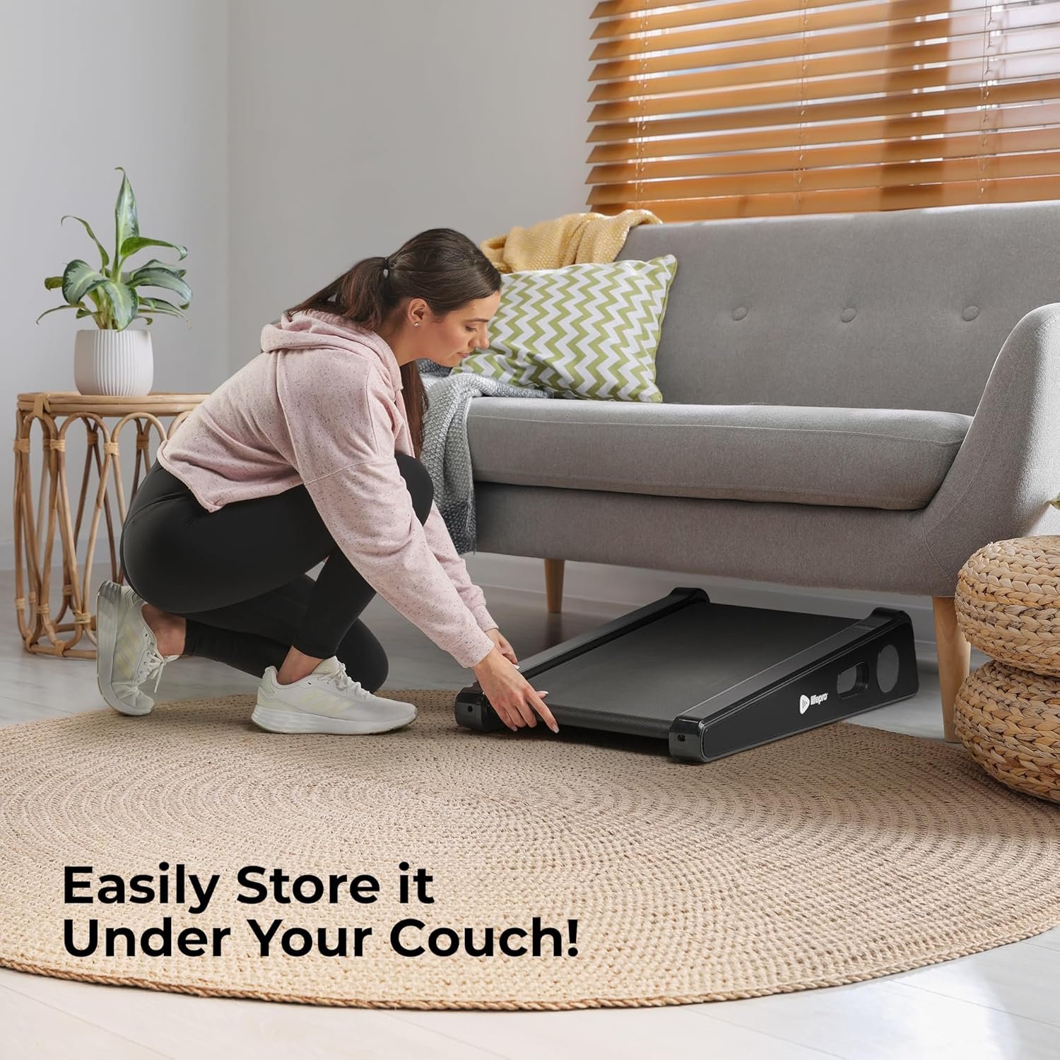 EASY TRAVEL & STORAGE – Thanks to its wheels and compact dimensions, you can easily take the portable walking pad under desk treadmill wherever you go, or tuck it out of the way when not in use!
