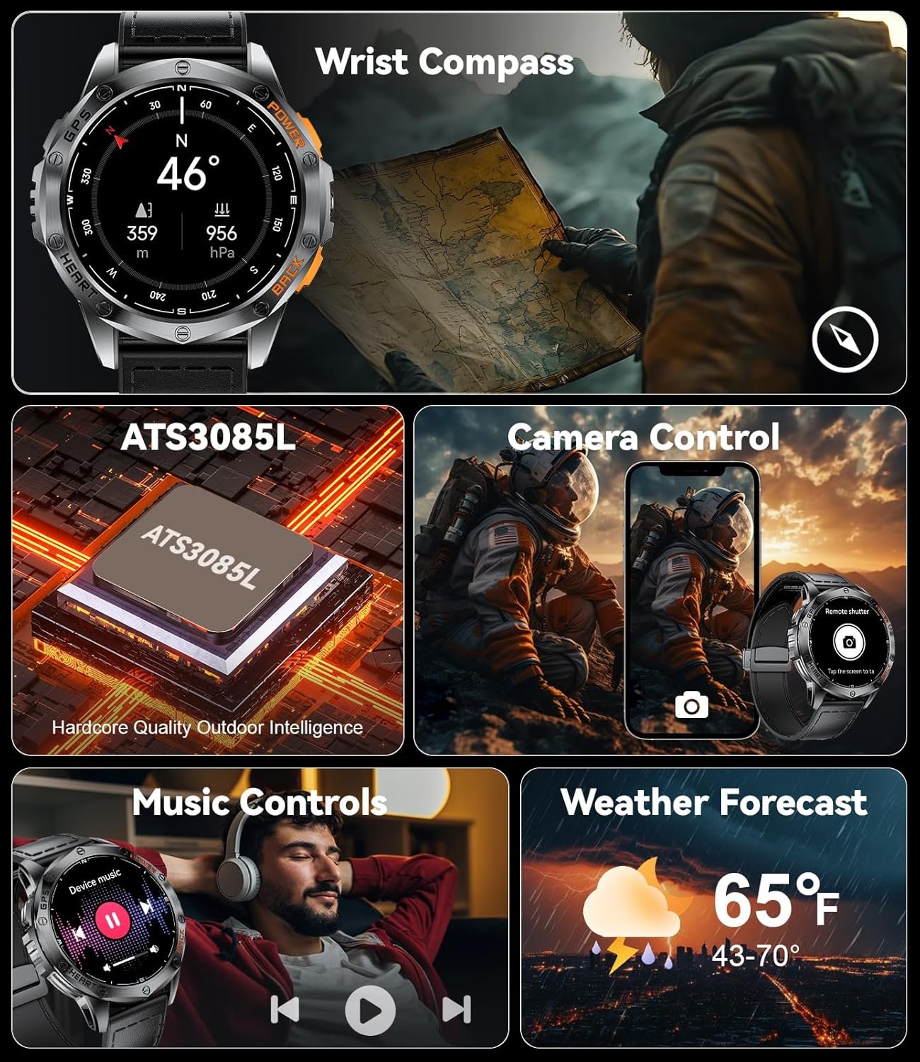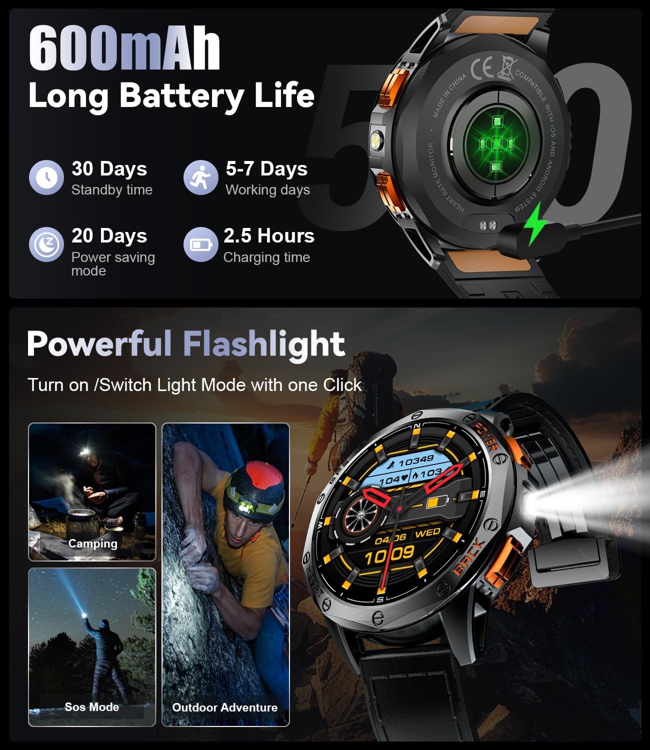 🧭【Compass & GPS & LED Flashlight】 This smart watch men is equipped with an accurate GPS positioning system and compass, providing comprehensive support for your outdoor activities. For those who enjoy hiking or cycling, the GPS and compass feature is especially important, enhancing safety and adding to the enjoyment of outdoor activities. Additionally, the mens smart watch includes a powerful flashlight function suitable for various situations. Whether you’re camping at night, searching for items, or dealing with emergencies, the flashlight provides ample illumination.