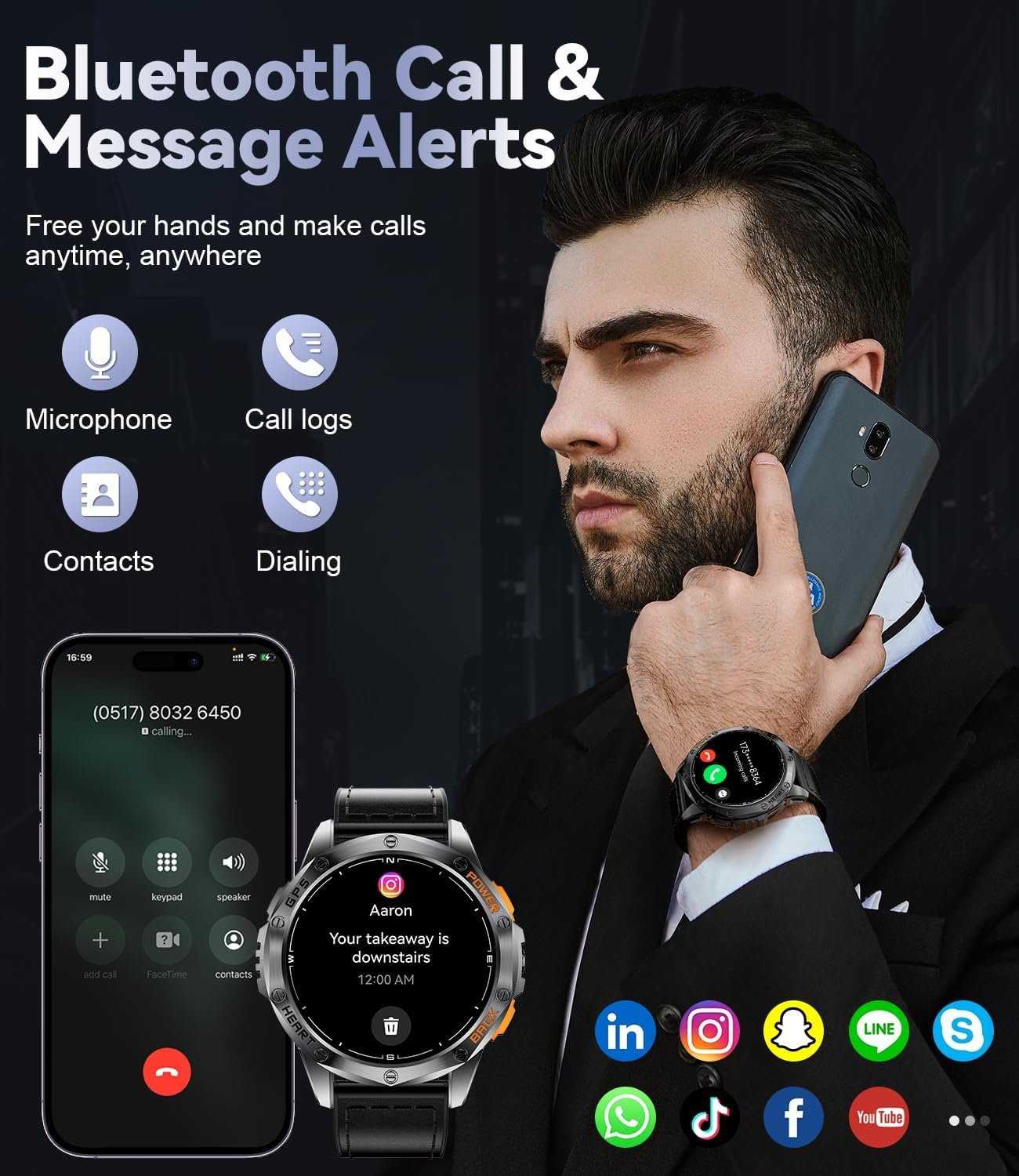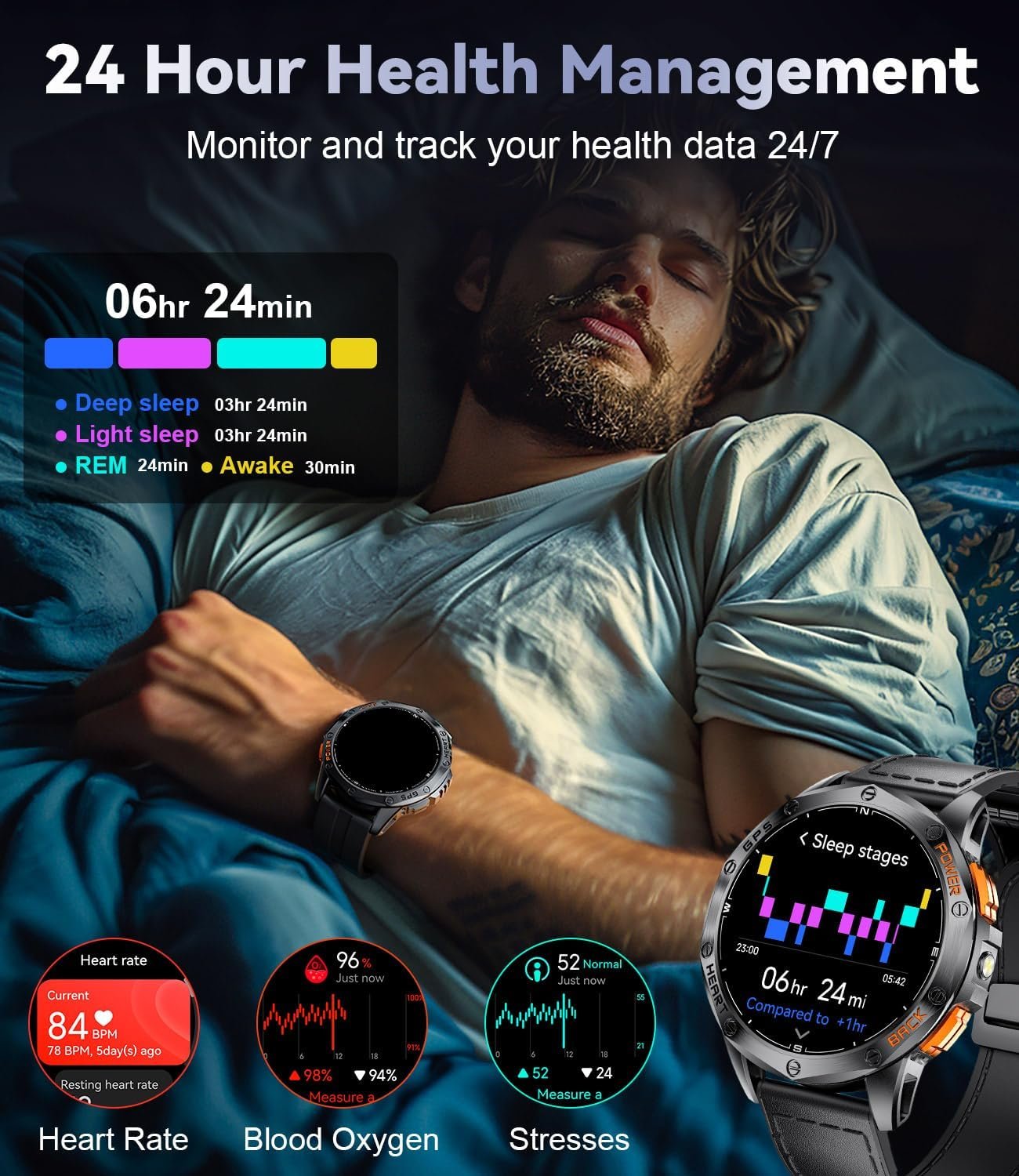 🛠【Military Smart Watch & Ergonomic Design】 This military smart watches has undergone rigorous testing to meet military standards, offering exceptional durability and shock resistance. Whether in extreme weather conditions or during intense activities, the smartwatch maintains its efficient functionality. Its casing is made from high-strength alloy materials, effectively resisting scratches, impacts, and corrosion, making it suitable for various harsh environments. Additionally, smart watches design takes ergonomics into full consideration, with a soft and comfortable strap that fits snugly around the wrist, ensuring comfort even during prolonged wear.