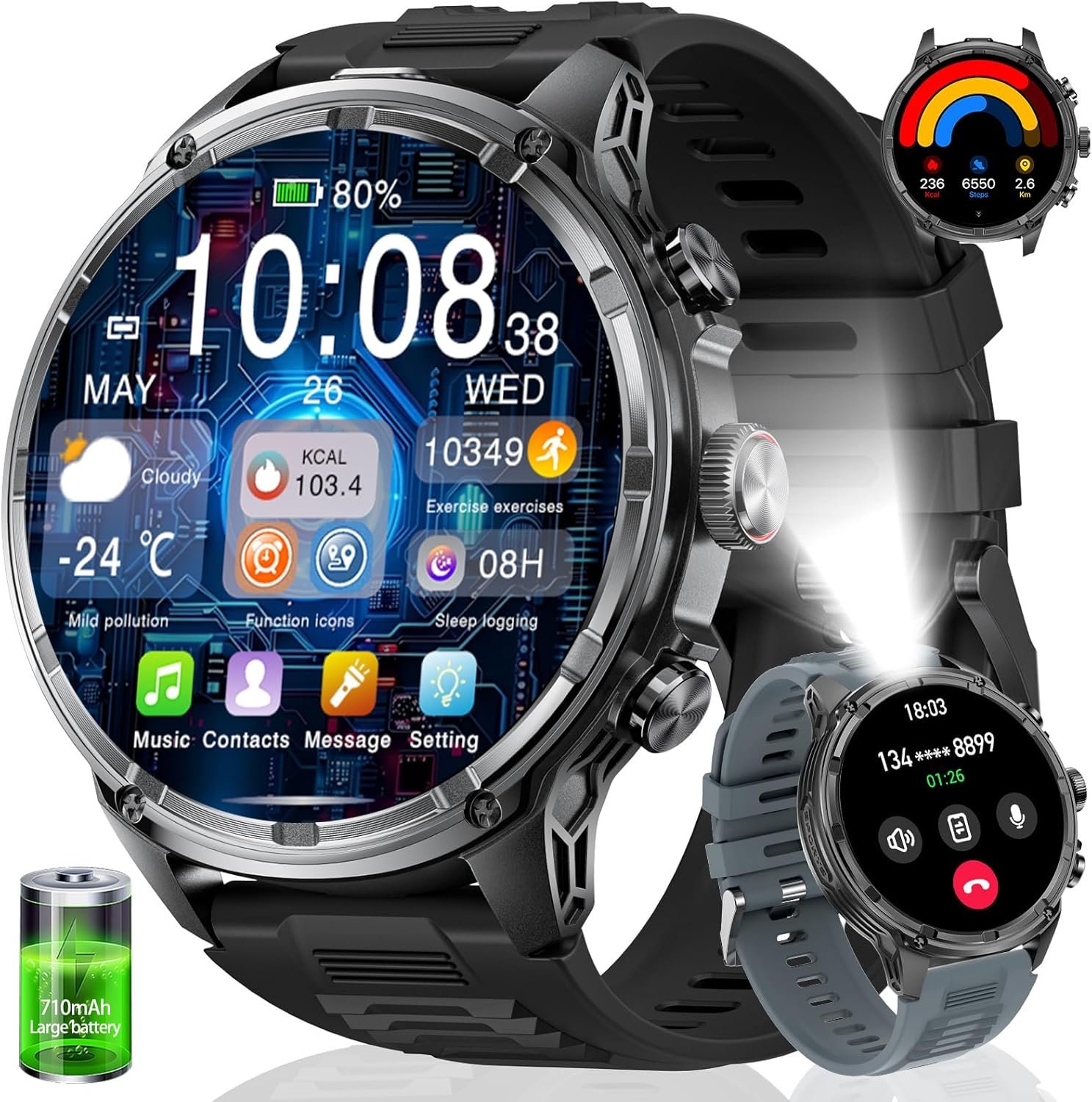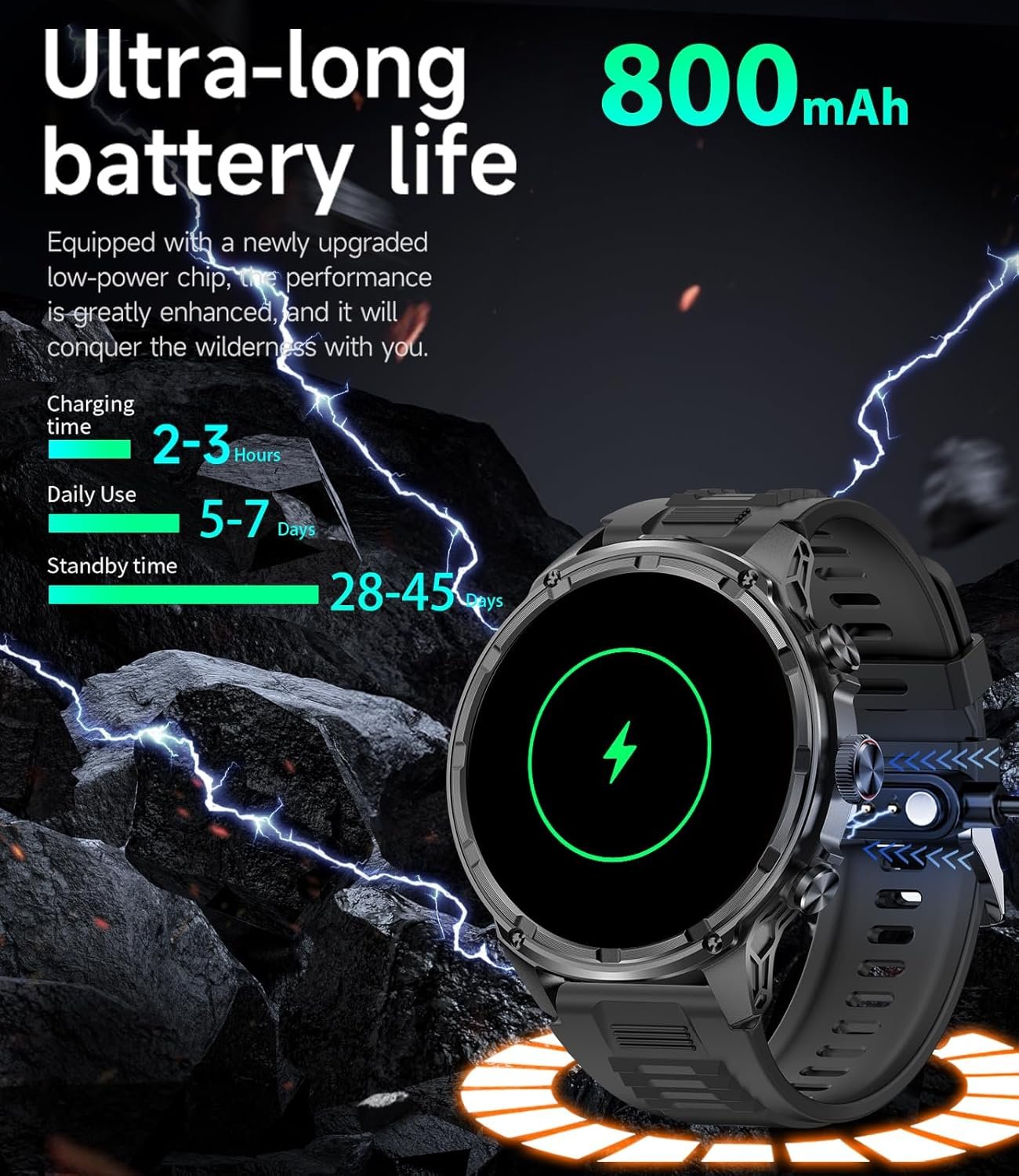 🎖️【710mAh large battery & 60 days standby】The rugges smart watch is equipped with a military-grade 100% pure cobalt battery, featuring a built-in 710mAh high-capacity battery, It supports continuous use for 8 to 10 days under normal conditions. The smartwatch is powered by an efficient, energy-saving processor chip and AI smart algorithms, allowing it to maintain low power consumption while executing tasks and optimizing task allocation. Even with a 1.85-inch large display, it ensures long-lasting battery life during daily high-frequency use. A full charge takes only two hours, you can wear the watch all day without the worry of frequent charging, making your life more convenient.