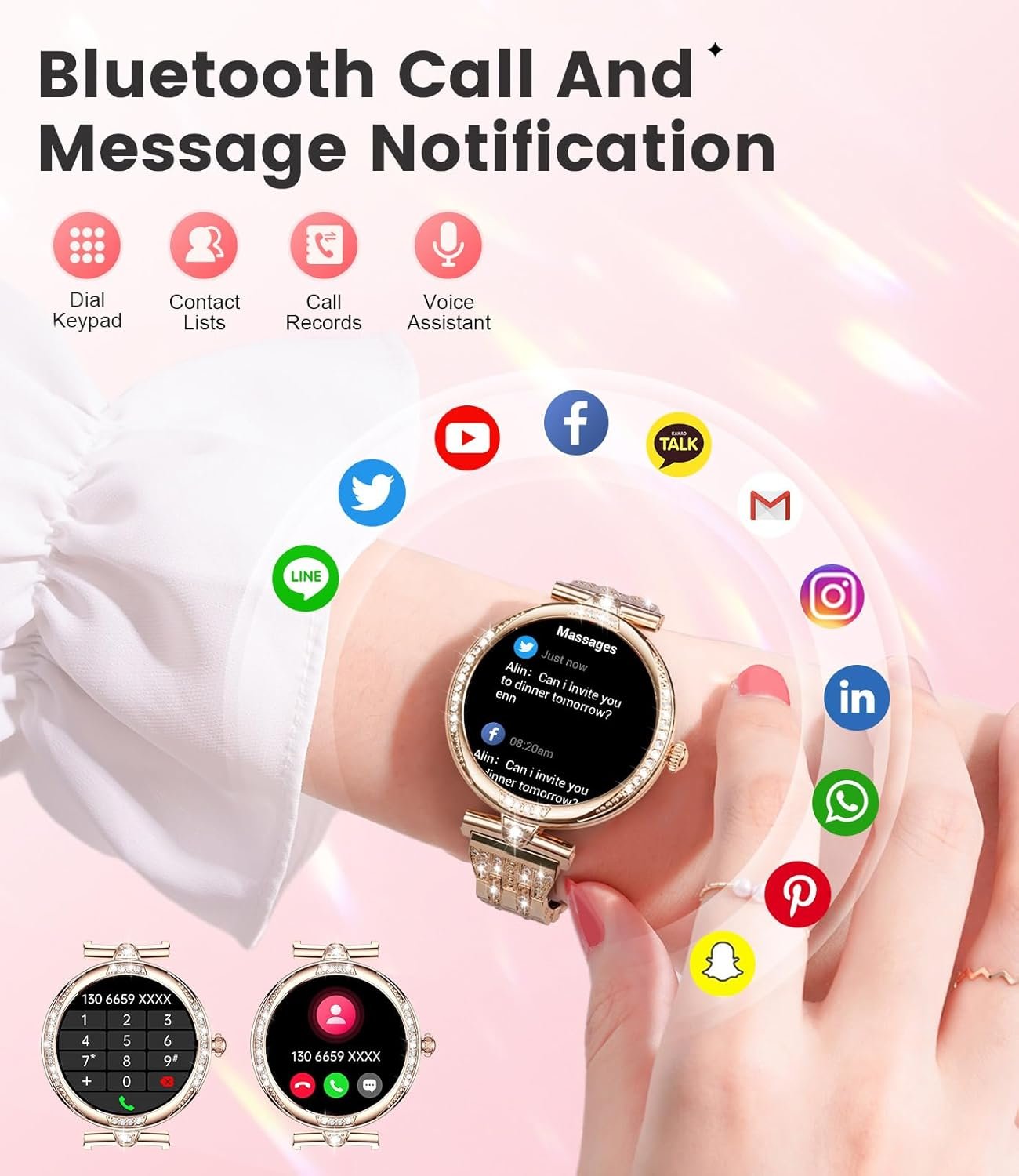 【Bluetooth Calling&Message Notifications】The lady smartwatch is equipped with the Bluetooth 5.2,which ensures faster and more stable connections.It features a 60-decibel speaker and a noise-cancelling microphone to ensure clarity during calls. Once paired with your smartphone, you can easily answer, make, and end calls, as well as view message notifications (SMS, Facebook, WhatsApp,Twitter, Tiktoketc.). Whether you’re in a meeting or exercising,the women smart watch helps you manage your communications quickly and efficiently. If you do not need this feature, you can easily turn it off. This simple and easy-to-use sports smartwatch is the perfect choice for both your work and daily life.