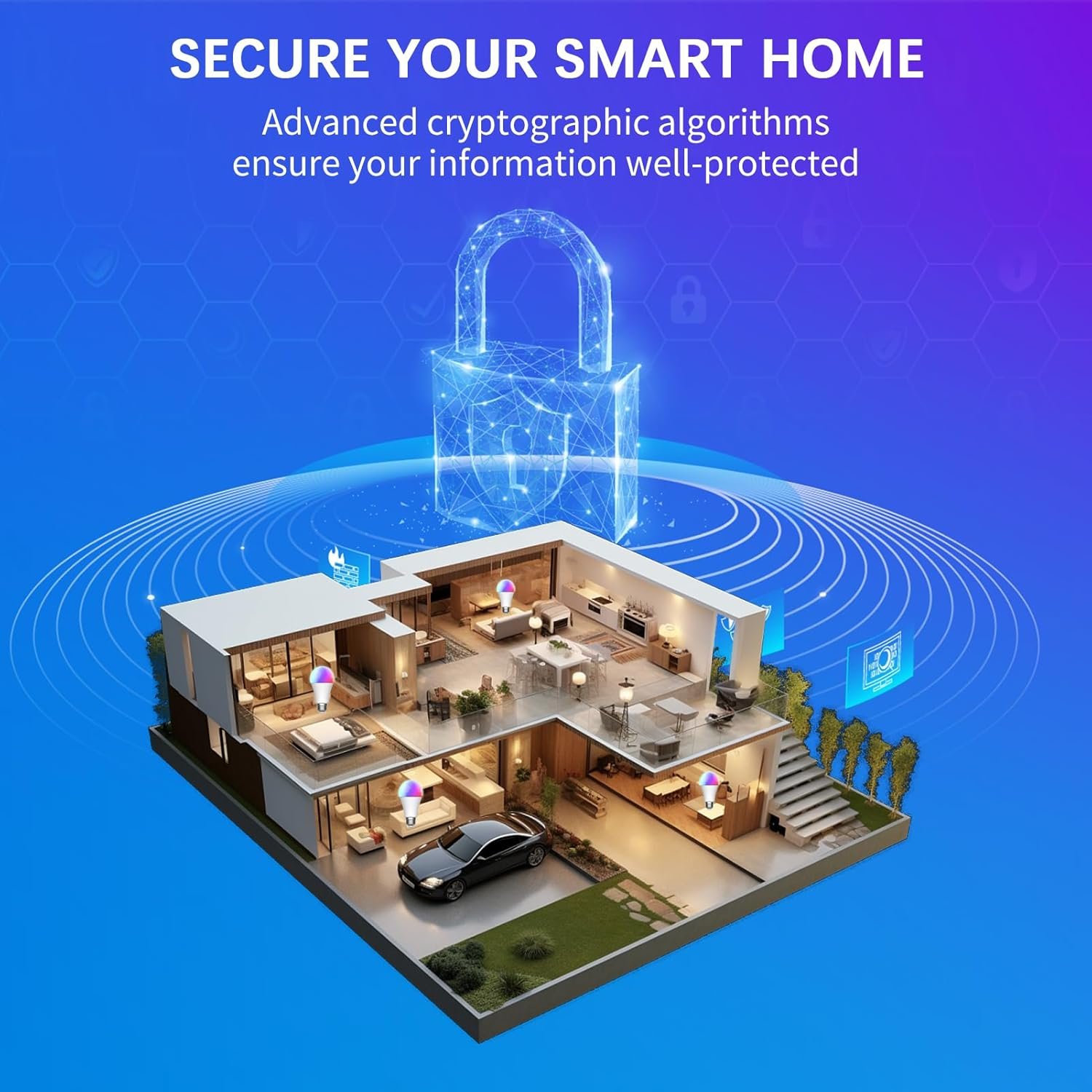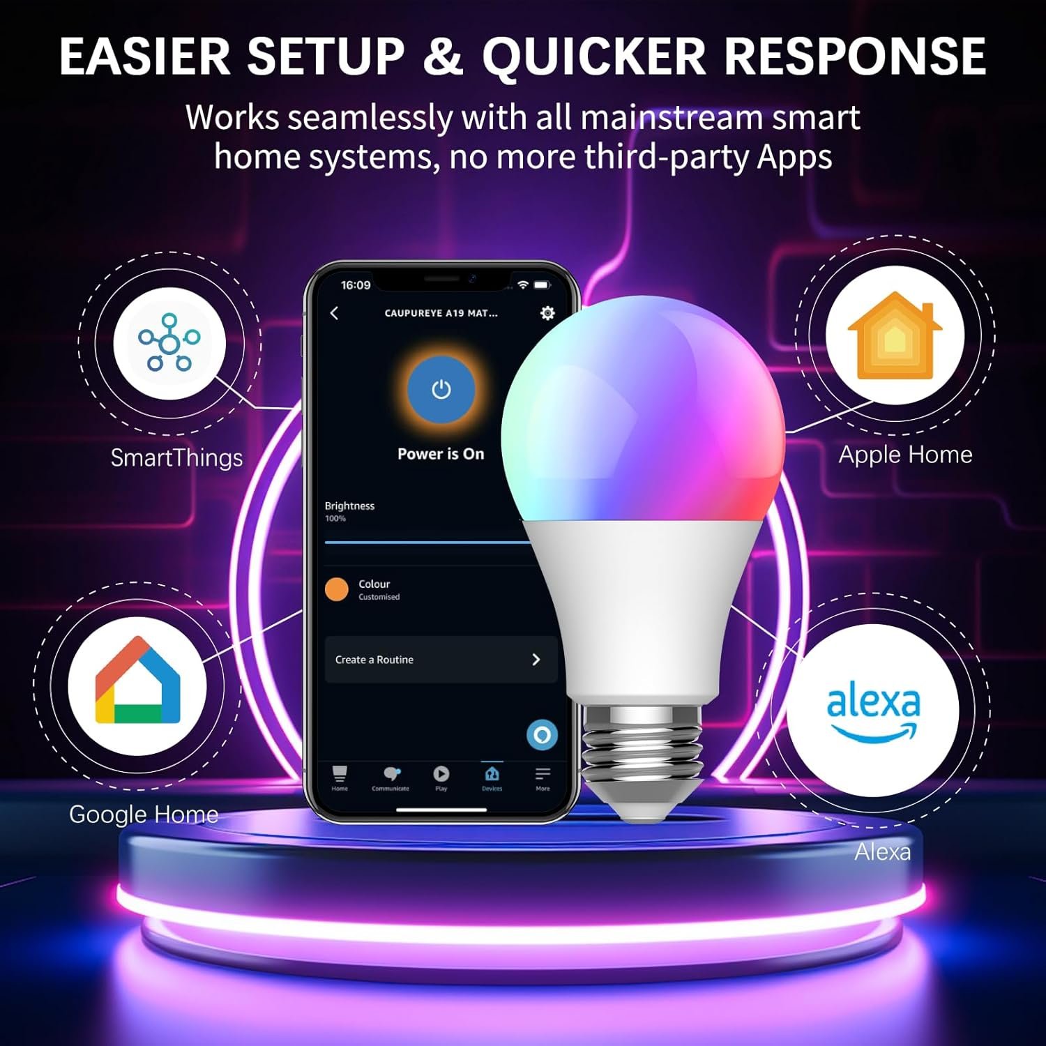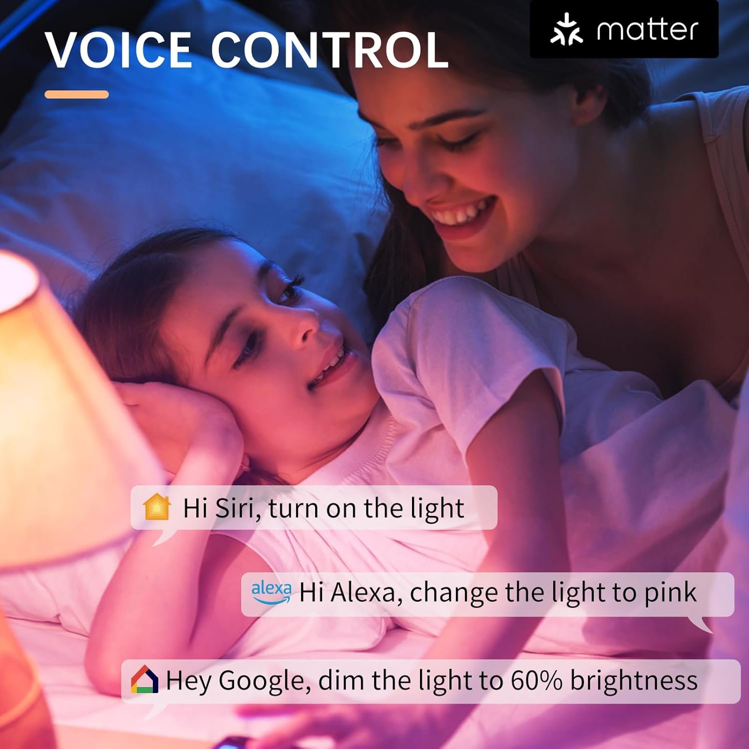 💡𝐌𝐚𝐭𝐭𝐞𝐫 𝐖𝐢𝐥𝐥 𝐒𝐢𝐦𝐩𝐥𝐢𝐟𝐲 𝐘𝐨𝐮𝐫 𝐒𝐦𝐚𝐫𝐭 𝐇𝐨𝐦𝐞 𝐄𝐱𝐩𝐞𝐫𝐢𝐞𝐧𝐜𝐞 – No more checking for the “Works With” HomeKit, Google Home, or Alexa badges; Our Matter Light Bulbs can work with all of them seamlessly. Compatible with your Alexa Echo, Apple TV, Home Pod, Google Home Speakers, and Nest Hub, the speed of response and stability of connection are greatly improved. No need for 3rd-party apps to control your smart bulbs is ideal for multiplatform homes. (Home Hub Required)