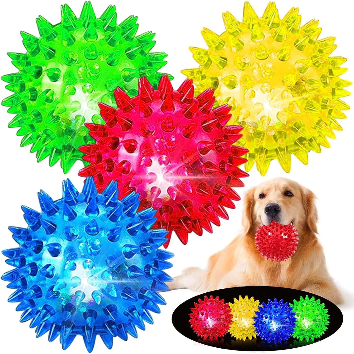 ✨LIGHT UP DOG BALLS SET : Package contains 4 transparent colored LED flashing bouncy balls in 4 colors, including yellow,blue,green and red, about 9cm/ 3.5 inches in diameter, featured with interactive flashing LED lights, easy to attract your dog’s attention, very suitable for night games.
