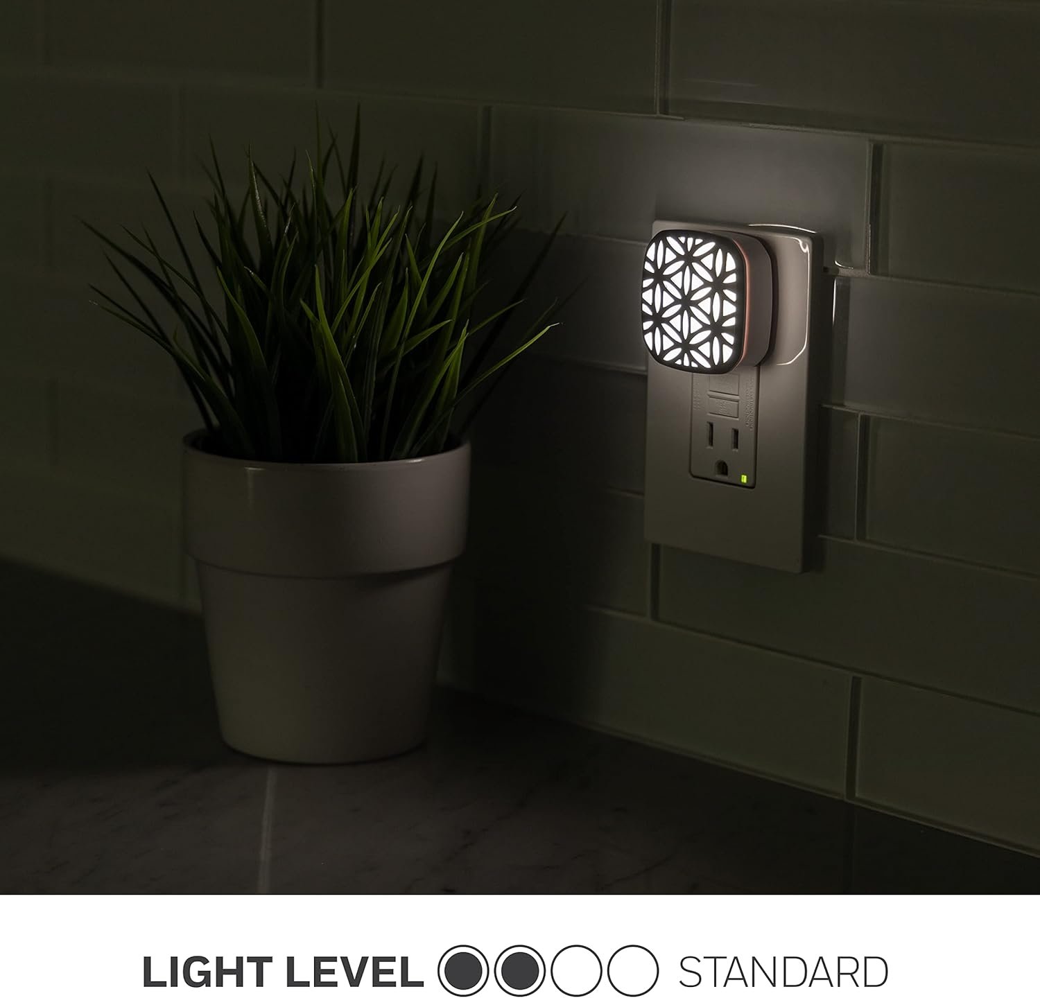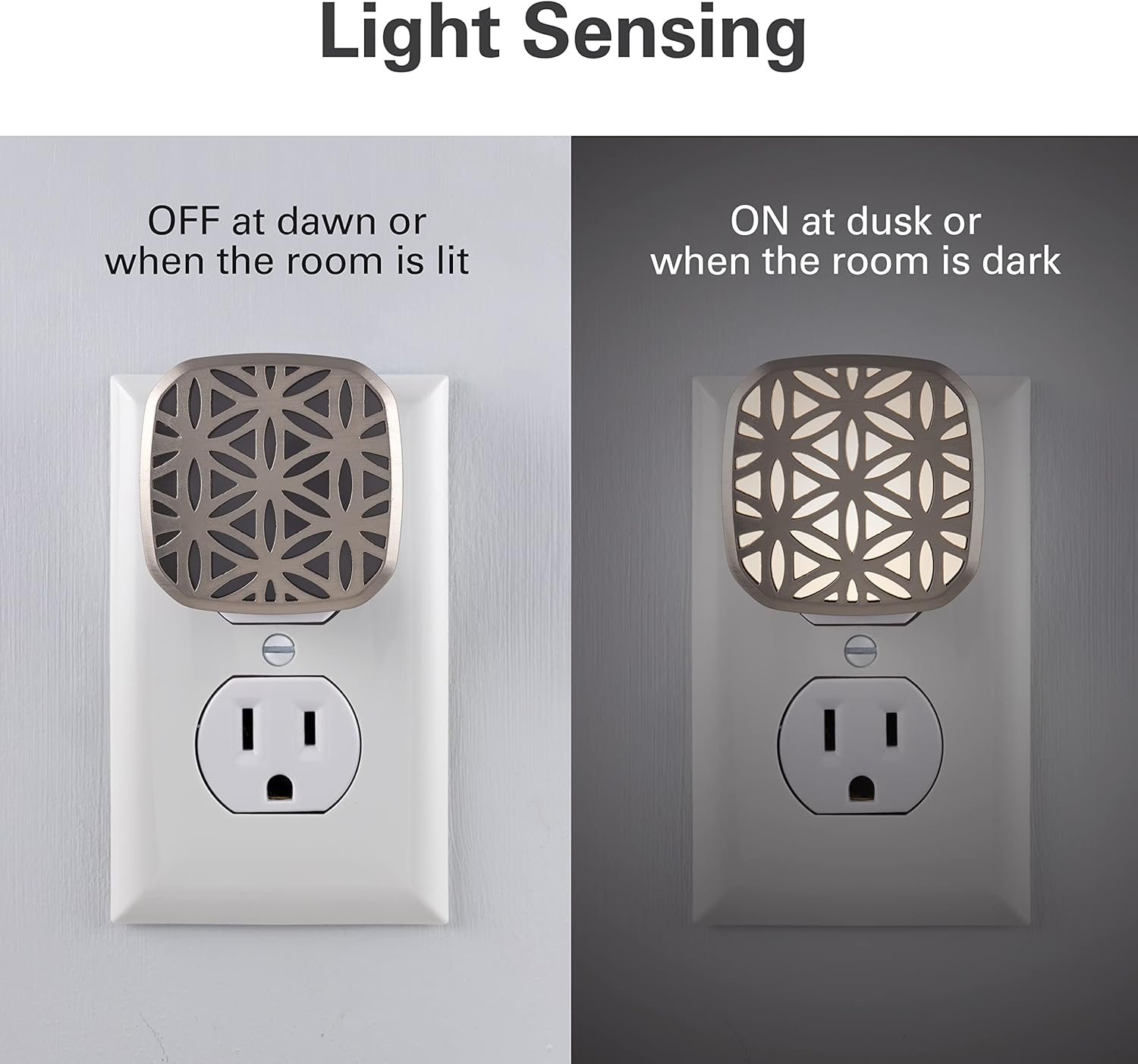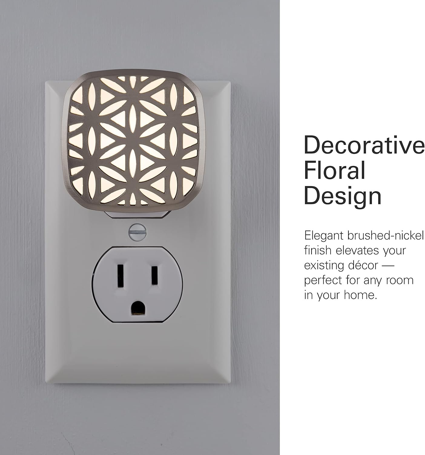 The Lights by Night Light-Sensing LED Half-CoverLite provides your home with stunning illumination through a beautifully designed frame. The attractive floral design and brushed-nickel finish effortlessly matches your established style and elevates your existing décor. Due to its smaller size, the light only takes up half of the outlet, which leaves plenty of room for you to plug other electronics into the second receptacle. This elegant night light is ideal for any room in your home. It looks great wherever you place it — whether it be in the bedroom, bathroom, living room or hallway! The light-sensing feature automatically turns the light ON at dusk, or when the room is dark, and OFF at dawn, or when the room is lit. Day after day, this night light makes sure your space is well-lit when you need it the most. It also saves you money with dependable energy-efficiency — costing only pennies per year. Light up your home in style with the Lights by Night Light-Sensing LED Half-CoverLite!