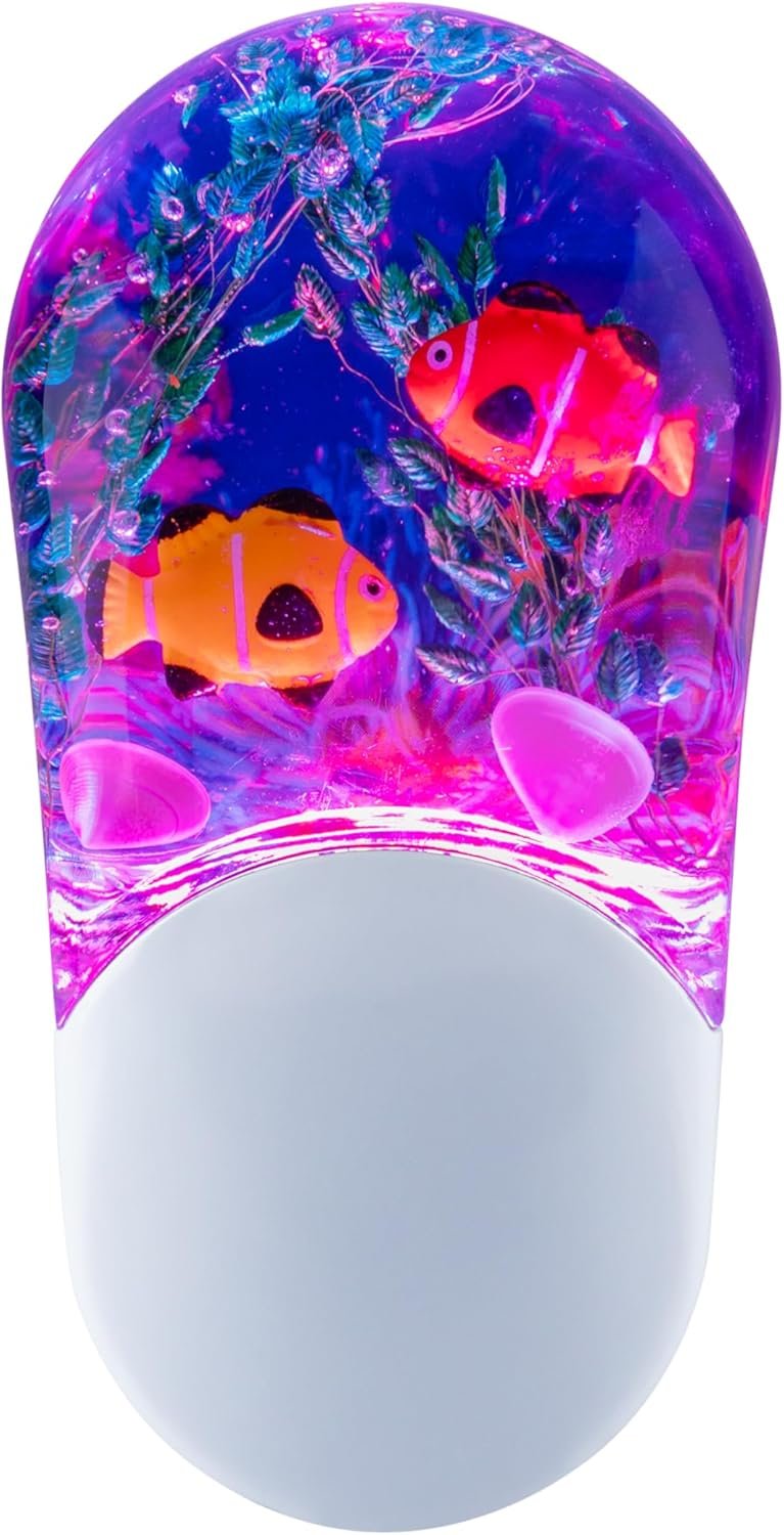 Add a little color to your night with the Aqualites Color-Changing LED Night Light. This colorful night light creates a soft glow behind a vibrant tropical fish image. The LED slowly changes color between red, blue, green and multi-color. With the light-sensing feature and long-life LEDs, this night light is energy efficient, since it turns on and off automatically with the change in room lighting. Its unique, space-saving design allows use of the second outlet without interference..