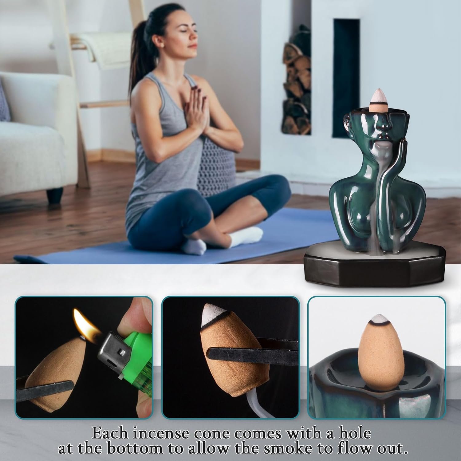 Placed the backflow incense burner on the included pad in a windless place,light the incense cone,then line up the flow hole and cone’s flow hole.