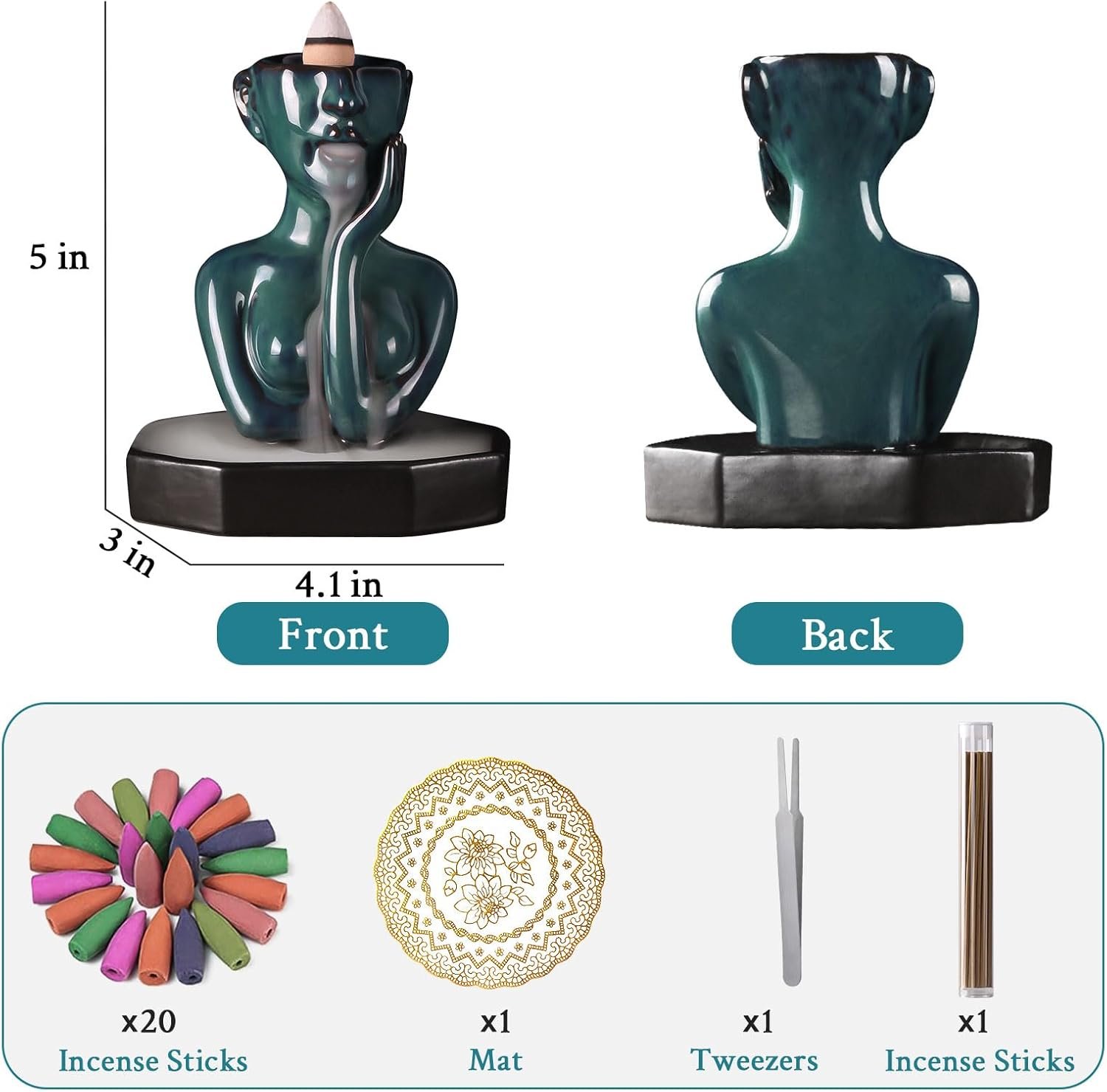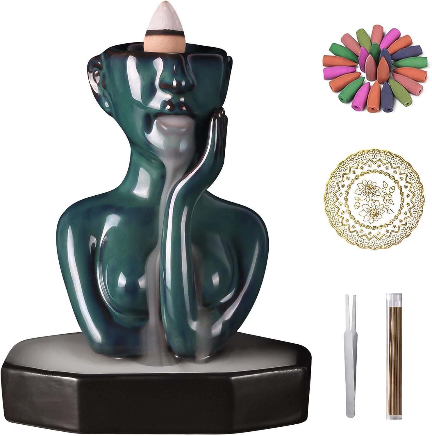 【Package included】Our insence-stick holder set includes a Statue incense burner, 20 backflow cones, 30 incense sticks, a metal tweezers, and a mat. With all the necessary accessories, you won’t need to purchase any additional items during the initial use. Friendly reminder: Ceramic is fragile, so please avoid placing it on an unstable or inclined surface to prevent collisions or damage from accidental drops. If you have any questions or need assistance, please feel free to contact us.