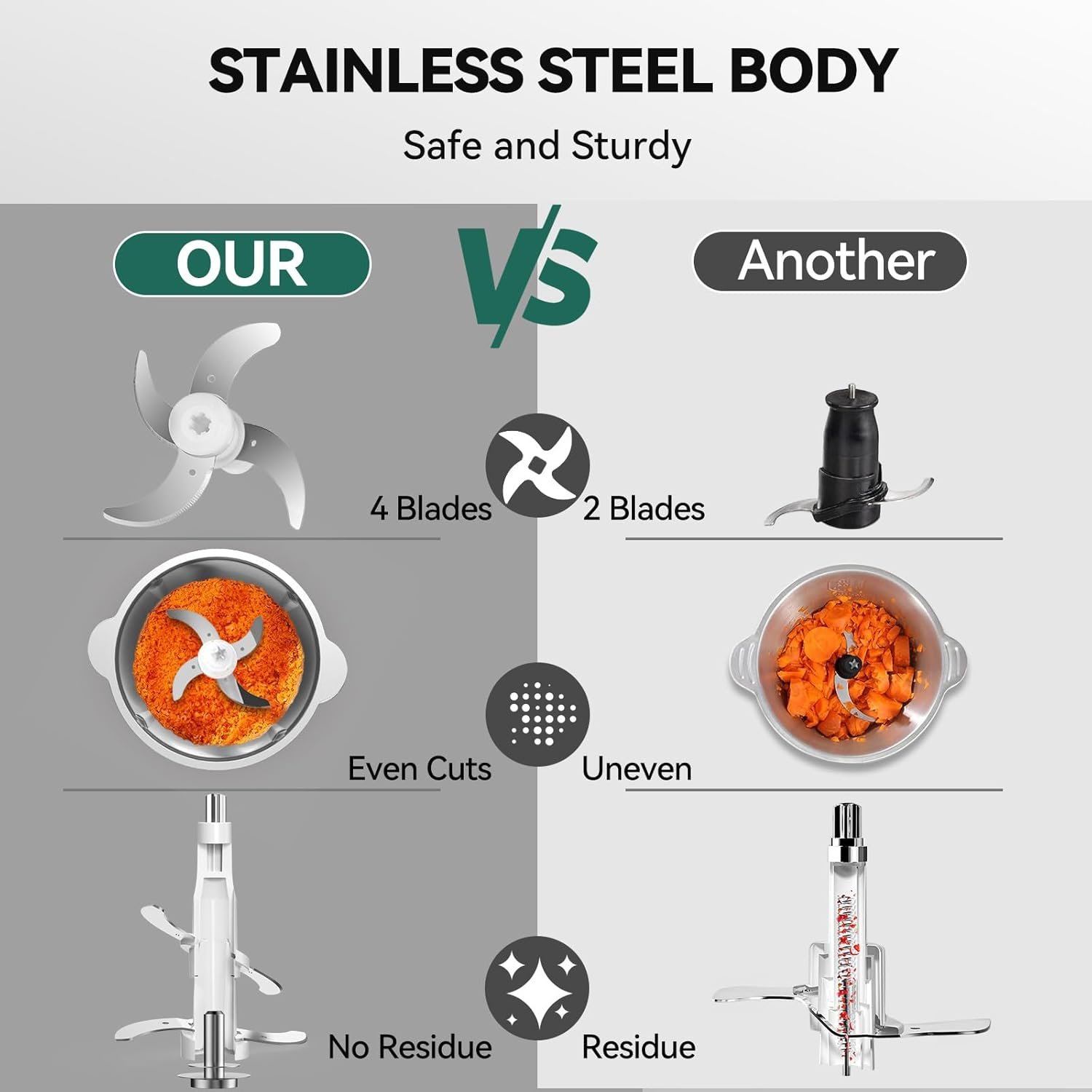 Easy to Clean & Store: stainless steel food chopper resist to scratch and corrosion, compact and lightweight, perfect size of this meat grinder electric for everyday use in the kitchen, dishwasher-safe